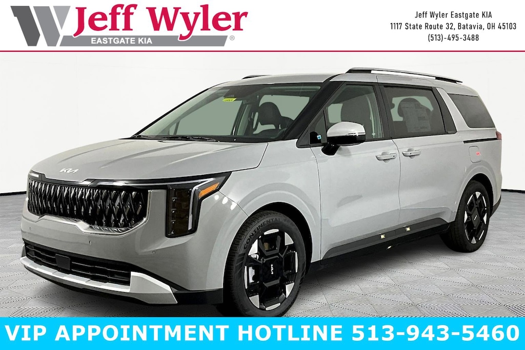 Ceramic Silver 2026 Kia Carnival EX V6 FWD 8-Speed Automatic 18/26 City/Highway MPG Jeff Wyler Eastgate Auto Mall is pleased to offer this terrific-looking 2026 Kia Carnival EX in Ceramic Silver. Well equipped with: 3.51 Axle Ratio, 3rd row seats: split-bench, 4-Wheel Disc Brakes, 8 Speakers, ABS brakes, Air Conditioning, Alloy wheels, AM/FM radio: SiriusXM, Apple CarPlay & Android Auto, Artificial Leather Seat Trim, Auto High-beam Headlights, Auto-Dimming Mirror with HomeLink, Automatic temperature control, Brake assist, Bumpers: body-color, Carpeted Floor Mats (8-Passenger), Compass, Delay-off headlights, Driver door bin, Driver vanity mirror, Dual front impact airbags, Dual front side impact airbags, Electronic Stability Control, Emergency communication system, Exterior Parking Camera Rear, Four wheel independent suspension, Front anti-roll bar, Front Bucket Seats, Front Center Armrest, Front dual zone A/C, Front reading lights, Fully automatic headlights, Heated door mirrors, Heated Front Bucket Seats, Heated front seats, Illuminated entry, Knee airbag, Leather Shift Knob, Leather steering wheel, Low tire pressure warning, Memory seat, Navigation System, Occupant sensing airbag, Outside temperature display, Overhead airbag, Overhead console, Panic alarm, Passenger door bin, Passenger vanity mirror, Power door mirrors, Power driver seat, Power Liftgate, Power passenger seat, Power steering, Power windows, Radio: AM/FM/HD Audio System, Rear air conditioning, Rear anti-roll bar, Rear reading lights, Rear window defroster, Rear window wiper, Reclining 3rd row seat, Remote keyless entry, Security system, Speed control, Speed-sensing steering, Split folding rear seat, Spoiler, Steering wheel mounted audio controls, Tachometer, Telescoping steering wheel, Tilt steering wheel, Traction control, Trip computer, Turn signal indicator mirrors, Variably intermittent wipers, and Wheels: 7.5J x 19" Machine-Finished Alloy. 18/26 City/Highway MPG