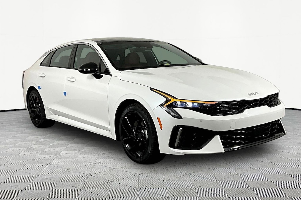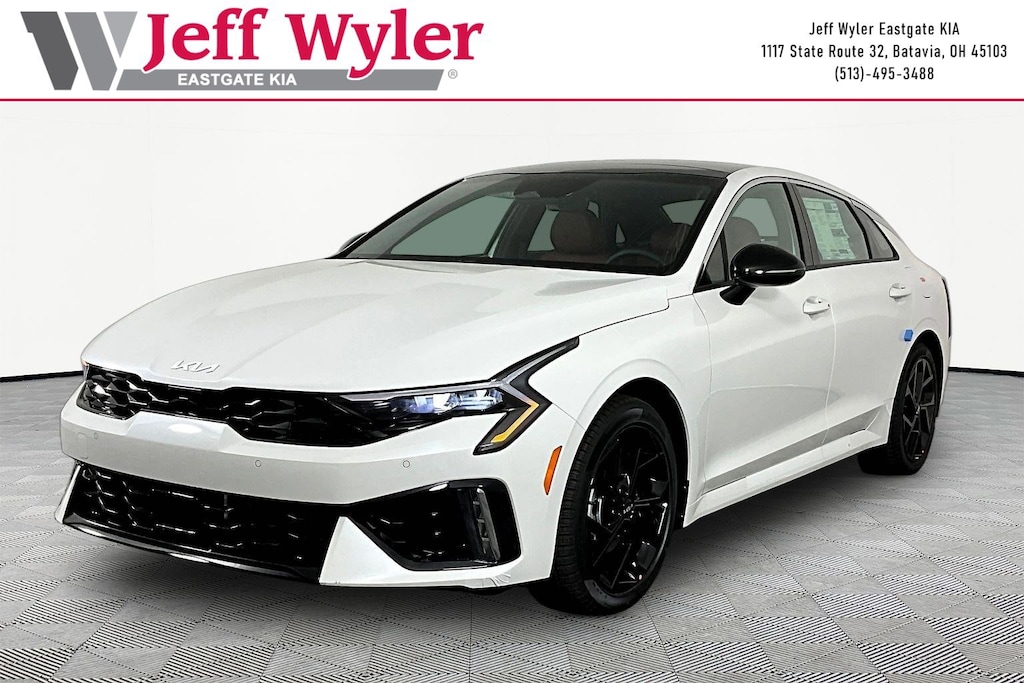 Snow White Pearl 2026 Kia K5 GT-Line I4 AWD 8-Speed Automatic 24/33 City/Highway MPG Jeff Wyler Eastgate Auto Mall is excited to offer this great-looking 2026 Kia K5 GT-Line in Snow White Pearl. Well equipped with: GT-Line Premium Package (Active Sound Design, Bose Premium Audio, LED Interior Lighting, Panoramic Sunroof, and Wheels: 18" x 7.5J Unique Gloss Black Alloy), GT-Line Red Interior Package (SynTex Seat Trim), 4-Wheel Disc Brakes, 6 Speakers, ABS brakes, Air Conditioning, Alloy wheels, AM/FM radio: SiriusXM, Apple CarPlay & Android Auto, Auto High-beam Headlights, Auto-Dimming Mirror with HomeLink, Automatic temperature control, Brake assist, Bumpers: body-color, Carpeted Floor Mats, Delay-off headlights, Driver door bin, Driver vanity mirror, Dual front impact airbags, Dual front side impact airbags, Electronic Stability Control, Emergency communication system: Kia Connect (includes 1 year free trial), Four wheel independent suspension, Front anti-roll bar, Front Bucket Seats, Front Center Armrest, Front dual zone A/C, Front fog lights, Front reading lights, Fully automatic headlights, Heated door mirrors, Heated Front Bucket Seats, Heated front seats, Heated steering wheel, Illuminated entry, Knee airbag, Leather Shift Knob, Leather steering wheel, Low tire pressure warning, Navigation System, Occupant sensing airbag, Outside temperature display, Overhead airbag, Overhead console, Panic alarm, Passenger door bin, Passenger vanity mirror, Power door mirrors, Power driver seat, Power steering, Power windows, Radio data system, Radio: AM/FM Audio System, Rear anti-roll bar, Rear seat center armrest, Rear side impact airbag, Rear window defroster, Remote keyless entry, Security system, Speed control, Speed-sensing steering, Split folding rear seat, Sport steering wheel, Steering wheel mounted audio controls, Tachometer, Telescoping steering wheel, Tilt steering wheel, Traction control, Trip computer, Turn signal indicator mirrors, Variably intermittent wipers, and Wheels: 18" x 7.5J Gloss Black Machined Finish Alloy. 24/33 City/Highway MPG