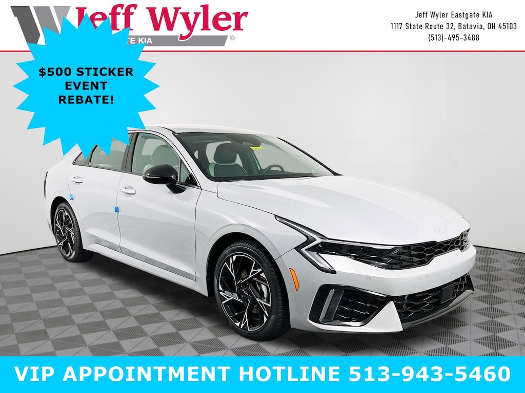 Wolf Gray 2026 Kia K5 GT-Line I4 AWD 8-Speed Automatic 24/33 City/Highway MPG Jeff Wyler Eastgate Auto Mall is excited to offer this good-looking 2026 Kia K5 GT-Line in Wolf Gray. Well equipped with: 4-Wheel Disc Brakes, 6 Speakers, ABS brakes, Air Conditioning, Alloy wheels, AM/FM radio: SiriusXM, Apple CarPlay & Android Auto, Auto High-beam Headlights, Automatic temperature control, Brake assist, Bumpers: body-color, Delay-off headlights, Driver door bin, Driver vanity mirror, Dual front impact airbags, Dual front side impact airbags, Electronic Stability Control, Emergency communication system: Kia Connect (includes 1 year free trial), Four wheel independent suspension, Front anti-roll bar, Front Bucket Seats, Front Center Armrest, Front dual zone A/C, Front fog lights, Front reading lights, Fully automatic headlights, Heated door mirrors, Heated Front Bucket Seats, Heated front seats, Heated steering wheel, Illuminated entry, Knee airbag, Leather Shift Knob, Leather steering wheel, Low tire pressure warning, Navigation System, Occupant sensing airbag, Outside temperature display, Overhead airbag, Overhead console, Panic alarm, Passenger door bin, Passenger vanity mirror, Power door mirrors, Power driver seat, Power steering, Power windows, Radio data system, Radio: AM/FM Audio System, Rear anti-roll bar, Rear seat center armrest, Rear side impact airbag, Rear window defroster, Remote keyless entry, Security system, Speed control, Speed-sensing steering, Split folding rear seat, Sport steering wheel, Steering wheel mounted audio controls, Tachometer, Telescoping steering wheel, Tilt steering wheel, Traction control, Trip computer, Turn signal indicator mirrors, Variably intermittent wipers, and Wheels: 18" x 7.5J Gloss Black Machined Finish Alloy. 24/33 City/Highway MPG Price includes: $500 - Sticker Sales Event Retail Bonus Cash. Exp. 01/02/2026