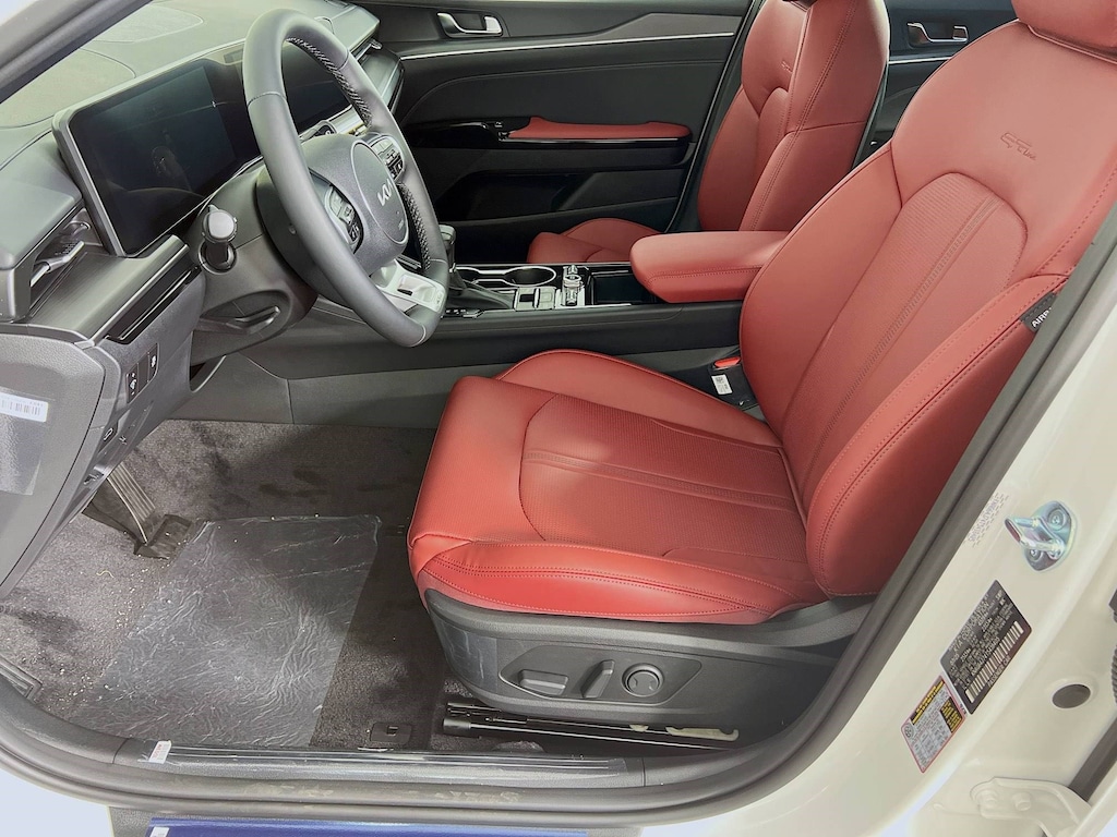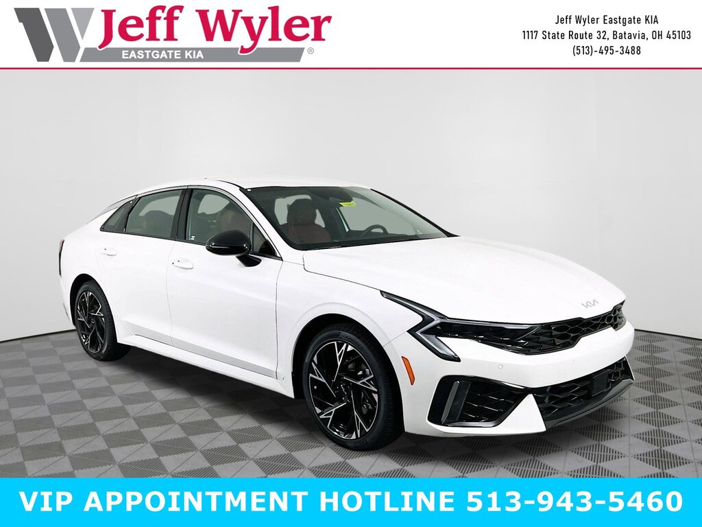 Snow White Pearl 2026 Kia K5 GT-Line I4 AWD 8-Speed Automatic 24/33 City/Highway MPG Jeff Wyler Eastgate Auto Mall is pumped up to offer this good-looking 2026 Kia K5 GT-Line in Snow White Pearl. Well equipped with: GT-Line Red Interior Package (SynTex Seat Trim), 4-Wheel Disc Brakes, 6 Speakers, ABS brakes, Air Conditioning, Alloy wheels, AM/FM radio: SiriusXM, Apple CarPlay & Android Auto, Auto High-beam Headlights, Automatic temperature control, Brake assist, Bumpers: body-color, Carpeted Floor Mats, Delay-off headlights, Driver door bin, Driver vanity mirror, Dual front impact airbags, Dual front side impact airbags, Electronic Stability Control, Emergency communication system: Kia Connect (includes 1 year free trial), Four wheel independent suspension, Front anti-roll bar, Front Bucket Seats, Front Center Armrest, Front dual zone A/C, Front fog lights, Front reading lights, Fully automatic headlights, Heated door mirrors, Heated Front Bucket Seats, Heated front seats, Heated steering wheel, Illuminated entry, Knee airbag, Leather Shift Knob, Leather steering wheel, Low tire pressure warning, Navigation System, Occupant sensing airbag, Outside temperature display, Overhead airbag, Overhead console, Panic alarm, Passenger door bin, Passenger vanity mirror, Power door mirrors, Power driver seat, Power steering, Power windows, Radio data system, Radio: AM/FM Audio System, Rear anti-roll bar, Rear seat center armrest, Rear side impact airbag, Rear window defroster, Remote keyless entry, Security system, Speed control, Speed-sensing steering, Split folding rear seat, Sport steering wheel, Steering wheel mounted audio controls, Tachometer, Telescoping steering wheel, Tilt steering wheel, Traction control, Trip computer, Turn signal indicator mirrors, Variably intermittent wipers, and Wheels: 18" x 7.5J Gloss Black Machined Finish Alloy. 24/33 City/Highway MPG