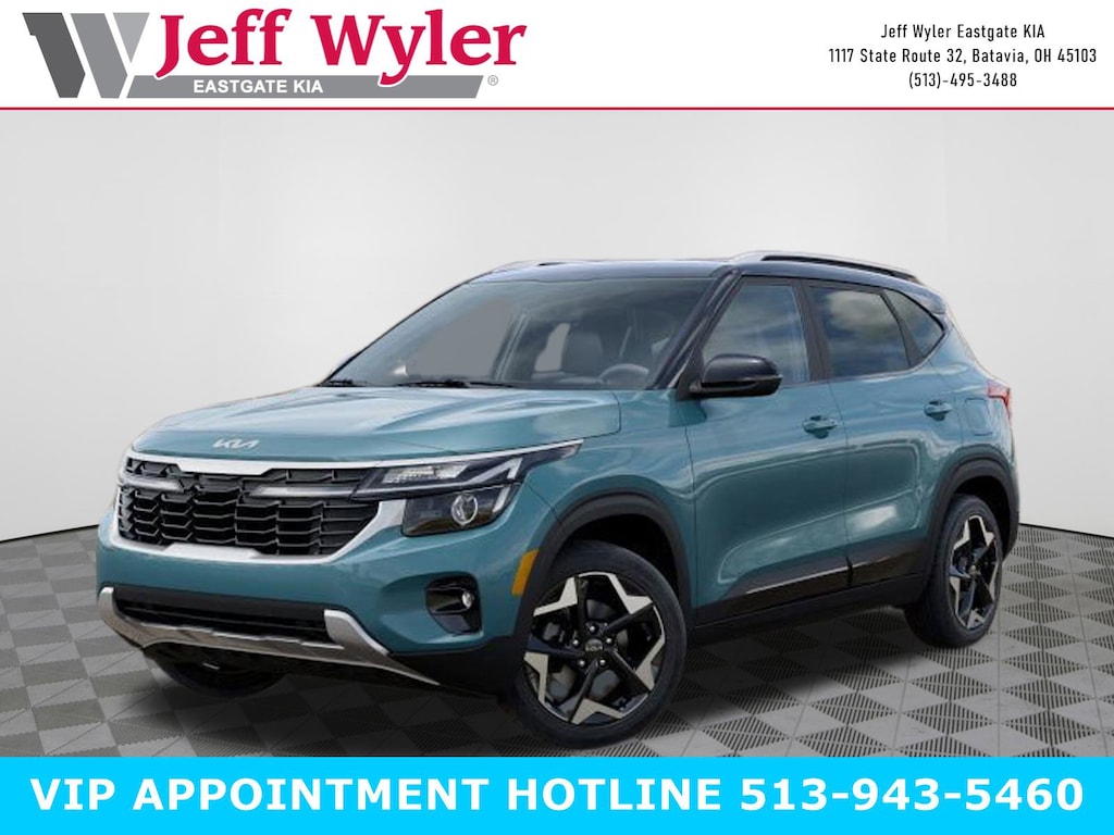 Pluton Blue/Black Roof 2026 Kia Seltos S 2.0L I4 MPI FWD CVT 28/34 City/Highway MPG Jeff Wyler Eastgate Auto Mall is pleased to offer this fantastic 2026 Kia Seltos S in Pluton Blue/Black Roof. Well equipped with: Glossy Black Door Garnish Package (Glossy Black Door Garnish), 4-Wheel Disc Brakes, 6 Speakers, ABS brakes, Air Conditioning, Alloy wheels, AM/FM radio: SiriusXM, Apple CarPlay & Android Auto, Auto High-beam Headlights, Auto-Dimming Mirror w/HomeLink, Automatic temperature control, Brake assist, Bumpers: body-color, Cloth & Artificial Leather Seat Trim, Delay-off headlights, Driver door bin, Driver vanity mirror, Dual front impact airbags, Dual front side impact airbags, Electronic Stability Control, Emergency communication system: 911 Connect, Exterior Parking Camera Rear, Front anti-roll bar, Front Bucket Seats, Front Center Armrest, Front fog lights, Front reading lights, Front wheel independent suspension, Fully automatic headlights, Heated door mirrors, Illuminated entry, Leather Shift Knob, Leather steering wheel, Low tire pressure warning, Navigation System, Occupant sensing airbag, Outside temperature display, Overhead airbag, Overhead console, Panic alarm, Passenger door bin, Passenger vanity mirror, Power door mirrors, Power steering, Power windows, Radio: AM/FM/HD/Satellite Display System w/Navigation, Rear seat center armrest, Rear window defroster, Rear window wiper, Remote keyless entry, Security system, Speed control, Speed-sensing steering, Split folding rear seat, Spoiler, Steering wheel mounted audio controls, Tachometer, Telescoping steering wheel, Tilt steering wheel, Traction control, Trip computer, Turn signal indicator mirrors, Variably intermittent wipers, and Wheels: 17" Alloy w/Machined Finished. 28/34 City/Highway MPG