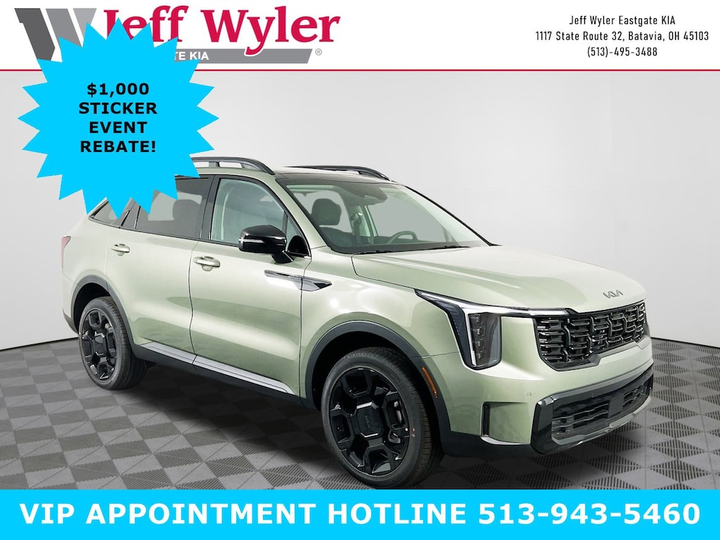 Jungle Green 2026 Kia Sorento EX 2.5L I4 DGI Turbocharged DOHC 16V LEV3-SULEV30 281hp AWD 8 Speed Dual Clutch 20/27 City/Highway MPG Jeff Wyler Eastgate Auto Mall is very proud to offer this outstanding-looking 2026 Kia Sorento EX in Jungle Green. Well equipped with: 3rd row seats: split-bench, 4-Wheel Disc Brakes, ABS brakes, Air Conditioning, All Weather Floor Mats, Alloy wheels, AM/FM radio: SiriusXM, Apple CarPlay & Android Auto, Auto High-beam Headlights, Auto-dimming Rear-View mirror, Automatic temperature control, Brake assist, Bumpers: body-color, Delay-off headlights, Driver door bin, Driver vanity mirror, Dual front impact airbags, Dual front side impact airbags, Electronic Stability Control, Emergency communication system: 911 Connect, Exterior Parking Camera Rear, Four wheel independent suspension, Front anti-roll bar, Front Bucket Seats, Front Center Armrest, Front dual zone A/C, Front fog lights, Front reading lights, Fully automatic headlights, Heated door mirrors, Heated Front Bucket Seats, Heated front seats, Illuminated entry, Knee airbag, Leather Shift Knob, Leather steering wheel, Low tire pressure warning, Navigation System, Occupant sensing airbag, Outside temperature display, Overhead airbag, Overhead console, Panic alarm, Passenger door bin, Passenger vanity mirror, Power door mirrors, Power driver seat, Power Liftgate, Power passenger seat, Power steering, Power windows, Radio data system, Radio: AM/FM Standard Sound System, Rear anti-roll bar, Rear reading lights, Rear side impact airbag, Rear window defroster, Rear window wiper, Remote keyless entry, Security system, Speed control, Speed-sensing steering, Split folding rear seat, Spoiler, Steering wheel mounted audio controls, SynTex Artificial Leather Seat Trim, Tachometer, Telescoping steering wheel, Tilt steering wheel, Traction control, Trip computer, Turn signal indicator mirrors, and Variably intermittent wipers. 20/27 City/Highway MPG