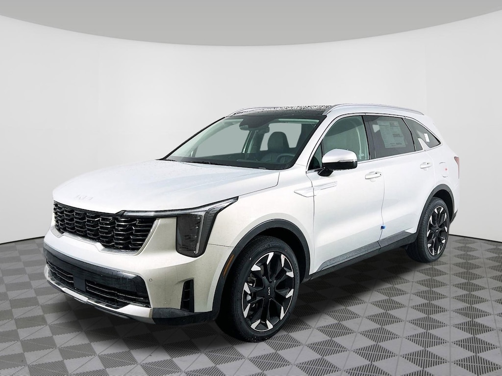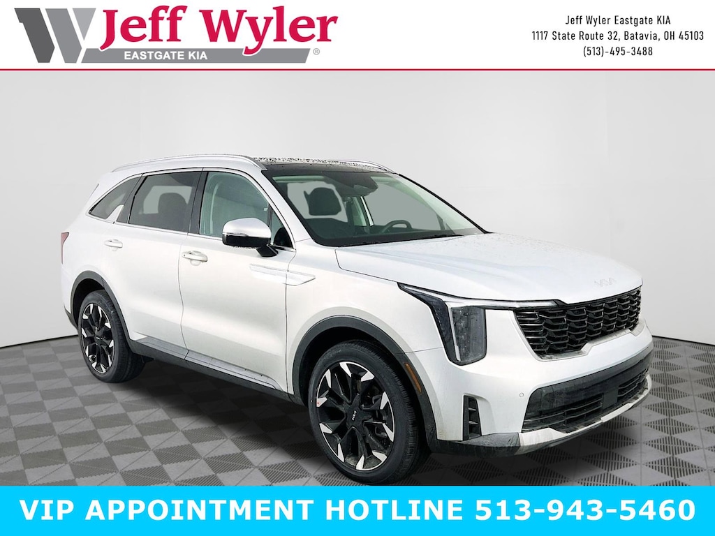 Ivory Silver 2026 Kia Sorento EX 2.5L I4 DGI Turbocharged DOHC 16V LEV3-SULEV30 281hp FWD 8 Speed Dual Clutch 20/29 City/Highway MPG Jeff Wyler Eastgate Auto Mall is proud to offer this superb-looking 2026 Kia Sorento EX in Ivory Silver. Well equipped with: EX Premium Package (2nd Row Captain's Chairs, Full-Length One-Touch Panoroof w/Sliding Sunshade, LED Interior Lighting, and Radio: AM/FM Bose Premium Audio System), 3rd row seats: split-bench, 4-Wheel Disc Brakes, 6 Speakers, ABS brakes, Air Conditioning, Alloy wheels, AM/FM radio: SiriusXM, Apple CarPlay & Android Auto, Auto High-beam Headlights, Auto-dimming Rear-View mirror, Automatic temperature control, Brake assist, Bumpers: body-color, Carpeted Floor Mats, Delay-off headlights, Driver door bin, Driver vanity mirror, Dual front impact airbags, Dual front side impact airbags, Electronic Stability Control, Emergency communication system: 911 Connect, Exterior Parking Camera Rear, Four wheel independent suspension, Front anti-roll bar, Front Bucket Seats, Front Center Armrest, Front dual zone A/C, Front fog lights, Front reading lights, Fully automatic headlights, Heated door mirrors, Heated Front Bucket Seats, Heated front seats, Illuminated entry, Knee airbag, Leather Shift Knob, Leather steering wheel, Low tire pressure warning, Navigation System, Occupant sensing airbag, Outside temperature display, Overhead airbag, Overhead console, Panic alarm, Passenger door bin, Passenger vanity mirror, Power door mirrors, Power driver seat, Power Liftgate, Power passenger seat, Power steering, Power windows, Radio data system, Radio: AM/FM Standard Sound System, Rear anti-roll bar, Rear reading lights, Rear seat center armrest, Rear side impact airbag, Rear window defroster, Rear window wiper, Remote keyless entry, Security system, Speed control, Speed-sensing steering, Split folding rear seat, Spoiler, Steering wheel mounted audio controls, SynTex Artificial Leather Seat Trim, Tachometer, Telescoping steering wheel, Tilt steering wheel, Traction control, Trip computer, Turn signal indicator mirrors, Variably intermittent wipers, and Wheels: 20" Machine-Finished Gloss Black Alloy. 20/29 City/Highway MPG