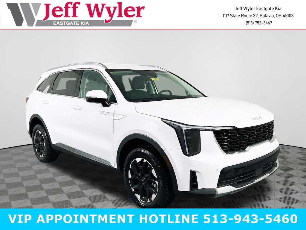 Glacial White Pearl 2026 Kia Sorento S 2.5L I4 DGI DOHC 16V LEV3-SULEV30 191hp AWD 8-Speed Automatic 23/28 City/Highway MPG Jeff Wyler Eastgate Auto Mall is very proud to offer this good-looking 2026 Kia Sorento S in Glacial White Pearl. Well equipped with: 3rd row seats: split-bench, 4-Wheel Disc Brakes, 6 Speakers, ABS brakes, Air Conditioning, Alloy wheels, AM/FM radio: SiriusXM, Apple CarPlay & Android Auto, Auto High-beam Headlights, Auto-Dimming Mirror w/HomeLink, Automatic temperature control, Brake assist, Bumpers: body-color, Carpeted Floor Mats, Delay-off headlights, Driver door bin, Driver vanity mirror, Dual front impact airbags, Dual front side impact airbags, Electronic Stability Control, Emergency communication system: 911 Connect, Exterior Parking Camera Rear, Four wheel independent suspension, Front anti-roll bar, Front Bucket Seats, Front Center Armrest, Front dual zone A/C, Front reading lights, Fully automatic headlights, Heated door mirrors, Heated Front Bucket Seats, Heated front seats, Illuminated entry, Knee airbag, Leather Shift Knob, Leather steering wheel, Low tire pressure warning, Occupant sensing airbag, Outside temperature display, Overhead airbag, Overhead console, Panic alarm, Passenger door bin, Passenger vanity mirror, Power door mirrors, Power driver seat, Power steering, Power windows, Radio data system, Radio: AM/FM Standard Sound System, Rear anti-roll bar, Rear reading lights, Rear seat center armrest, Rear side impact airbag, Rear window defroster, Rear window wiper, Remote keyless entry, Security system, Speed control, Speed-sensing steering, Split folding rear seat, Spoiler, Steering wheel mounted audio controls, SynTex Artificial Leather Seat Trim, Tachometer, Telescoping steering wheel, Tilt steering wheel, Traction control, Trip computer, Turn signal indicator mirrors, Variably intermittent wipers, and Wheels: 18" Gloss Black Alloy. 23/28 City/Highway MPG