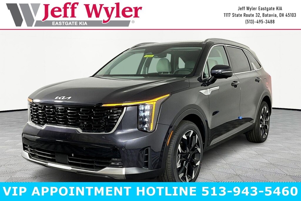 Priced below KBB Fair Purchase Price! Panthera Metal 2026 Kia Sorento SX 2.5L I4 DGI Turbocharged DOHC 16V LEV3-SULEV30 281hp FWD 8 Speed Dual Clutch 20/29 City/Highway MPG Jeff Wyler Eastgate Auto Mall is excited to offer this good-looking 2026 Kia Sorento SX in Panthera Metal. Well equipped with: 12 Speakers, 3rd row seats: split-bench, 4-Wheel Disc Brakes, ABS brakes, Air Conditioning, All Weather Floor Mats, Alloy wheels, AM/FM radio: SiriusXM, Apple CarPlay & Android Auto, Auto High-beam Headlights, Auto-dimming Rear-View mirror, Automatic temperature control, Brake assist, Bumpers: body-color, Delay-off headlights, Driver door bin, Driver vanity mirror, Dual front impact airbags, Dual front side impact airbags, Electronic Stability Control, Emergency communication system: 911 Connect, Exterior Parking Camera Rear, Four wheel independent suspension, Front anti-roll bar, Front Bucket Seats, Front Center Armrest, Front dual zone A/C, Front fog lights, Front reading lights, Fully automatic headlights, Garage door transmitter: HomeLink, Heated and Ventilated Front Bucket Seats, Heated door mirrors, Heated front seats, Heated steering wheel, Illuminated entry, Knee airbag, Leather Shift Knob, Leather steering wheel, Low tire pressure warning, Navigation System, Occupant sensing airbag, Outside temperature display, Overhead airbag, Overhead console, Panic alarm, Passenger door bin, Passenger vanity mirror, Power door mirrors, Power driver seat, Power Liftgate, Power moonroof, Power passenger seat, Power steering, Power windows, Radio data system, Radio: AM/FM Bose Premium Audio System, Rain sensing wipers, Rear anti-roll bar, Rear reading lights, Rear side impact airbag, Rear window defroster, Rear window wiper, Remote keyless entry, Security system, Speed control, Speed-sensing steering, Split folding rear seat, Spoiler, Steering wheel mounted audio controls, SynTex Artificial Leather Seat Trim, Tachometer, Telescoping steering wheel, Tilt steering wheel, Traction control, Trip computer, Turn signal indicator mirrors, Variably intermittent wipers, Ventilated front seats, and Wheels: 20" Machine-Finished Gloss Black Alloy. 20/29 City/Highway MPG Price includes: $2500 - Kia Customer Cash. Exp. 05/04/2026