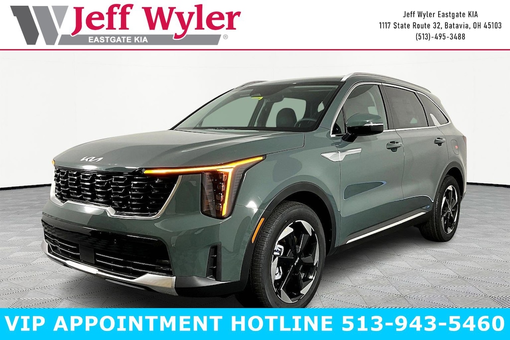 Priced below KBB Fair Purchase Price! Cityscape Green 2026 Kia Sorento Hybrid EX 1.6L Turbo GDI 4-Cylinder FWD 6-Speed Automatic 37/36 City/Highway MPG Jeff Wyler Eastgate Auto Mall is pleased to offer this superb 2026 Kia Sorento Hybrid EX in Cityscape Green. Well equipped with: 3rd row seats: split-bench, 4-Wheel Disc Brakes, 6 Speakers, ABS brakes, Air Conditioning, Alloy wheels, AM/FM radio: SiriusXM, Apple CarPlay & Android Auto, Auto High-beam Headlights, Auto-Dimming Mirror with HomeLink, Auto-dimming Rear-View mirror, Automatic temperature control, Brake assist, Bumpers: body-color, Carpeted Floor Mats, Delay-off headlights, Driver door bin, Driver vanity mirror, Dual front impact airbags, Dual front side impact airbags, Electronic Stability Control, Emergency communication system: 911 Connect, Exterior Parking Camera Rear, Four wheel independent suspension, Front anti-roll bar, Front Bucket Seats, Front Center Armrest, Front dual zone A/C, Front fog lights, Front reading lights, Fully automatic headlights, Heated door mirrors, Heated Front Bucket Seats, Heated front seats, Illuminated entry, Knee airbag, Leather steering wheel, Low tire pressure warning, Navigation System, Occupant sensing airbag, Outside temperature display, Overhead airbag, Overhead console, Panic alarm, Passenger door bin, Passenger vanity mirror, Power door mirrors, Power driver seat, Power Liftgate, Power passenger seat, Power steering, Power windows, Radio data system, Radio: AM/FM/SiriusXM Audio System, Rear anti-roll bar, Rear reading lights, Rear seat center armrest, Rear side impact airbag, Rear window defroster, Rear window wiper, Remote keyless entry, Security system, Speed control, Speed-sensing steering, Split folding rear seat, Spoiler, Steering wheel mounted audio controls, SynTex Artificial Leather Seat Trim, Tachometer, Telescoping steering wheel, Tilt steering wheel, Traction control, Trip computer, Turn signal indicator mirrors, Variably intermittent wipers, and Wheels: 19" Machine-Finished Aero Alloy. 37/36 City/Highway MPG Price includes: $2500 - Kia Customer Cash. Exp. 05/04/2026