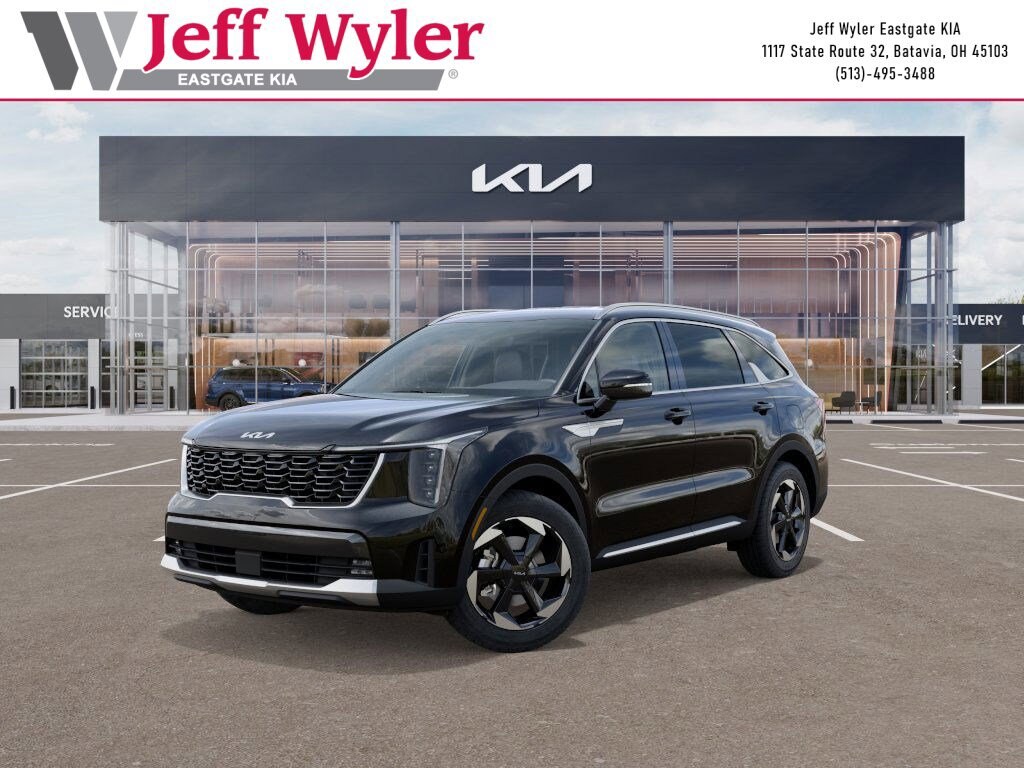 Aurora Black 2026 Kia Sorento Hybrid EX 1.6L Turbo GDI 4-Cylinder FWD 6-Speed Automatic 37/36 City/Highway MPG Jeff Wyler Eastgate Auto Mall is delighted to offer this terrific 2026 Kia Sorento Hybrid EX in Aurora Black. Well equipped with: 3rd row seats: split-bench, 4-Wheel Disc Brakes, 6 Speakers, ABS brakes, Air Conditioning, All Weather Floor Mats, Alloy wheels, AM/FM radio: SiriusXM, Apple CarPlay & Android Auto, Auto High-beam Headlights, Auto-Dimming Mirror w/HomeLink, Auto-dimming Rear-View mirror, Automatic temperature control, Brake assist, Bumpers: body-color, Delay-off headlights, Driver door bin, Driver vanity mirror, Dual front impact airbags, Dual front side impact airbags, Electronic Stability Control, Emergency communication system: 911 Connect, Exterior Parking Camera Rear, Four wheel independent suspension, Front anti-roll bar, Front Bucket Seats, Front Center Armrest, Front dual zone A/C, Front fog lights, Front reading lights, Fully automatic headlights, Heated door mirrors, Heated Front Bucket Seats, Heated front seats, Illuminated entry, Knee airbag, Leather steering wheel, Low tire pressure warning, Navigation System, Occupant sensing airbag, Outside temperature display, Overhead airbag, Overhead console, Panic alarm, Passenger door bin, Passenger vanity mirror, Power door mirrors, Power driver seat, Power Liftgate, Power passenger seat, Power steering, Power windows, Radio data system, Radio: AM/FM/SiriusXM Audio System, Rear anti-roll bar, Rear reading lights, Rear seat center armrest, Rear side impact airbag, Rear window defroster, Rear window wiper, Remote keyless entry, Security system, Speed control, Speed-sensing steering, Split folding rear seat, Spoiler, Steering wheel mounted audio controls, SynTex Artificial Leather Seat Trim, Tachometer, Telescoping steering wheel, Tilt steering wheel, Traction control, Trip computer, Turn signal indicator mirrors, Variably intermittent wipers, and Wheels: 19" Machine-Finished Aero Alloy. 37/36 City/Highway MPG
