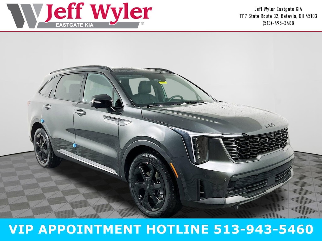 Interstellar Gray 2026 Kia Sorento Hybrid X-Line SX Prestige 1.6L Turbo GDI 4-Cylinder AWD 6-Speed Automatic 32/35 City/Highway MPG Jeff Wyler Eastgate Auto Mall is very proud to offer this terrific-looking 2026 Kia Sorento Hybrid X-Line SX Prestige in Interstellar Gray. Well equipped with: 12 Speakers, 3rd row seats: split-bench, 4-Wheel Disc Brakes, ABS brakes, Air Conditioning, All Weather Floor Mats, Alloy wheels, AM/FM radio: SiriusXM, Apple CarPlay & Android Auto, Auto High-beam Headlights, Auto-dimming Rear-View mirror, Automatic temperature control, Brake assist, Bumpers: body-color, Delay-off headlights, Driver door bin, Driver vanity mirror, Dual front impact airbags, Dual front side impact airbags, Electronic Stability Control, Emergency communication system: 911 Connect, Exterior Parking Camera Rear, Four wheel independent suspension, Front anti-roll bar, Front Bucket Seats, Front Center Armrest, Front dual zone A/C, Front fog lights, Front reading lights, Fully automatic headlights, Garage door transmitter: HomeLink, Heated & Ventilated Front Bucket Seats, Heated door mirrors, Heated front seats, Heated rear seats, Heated steering wheel, Illuminated entry, Knee airbag, Leather steering wheel, Low tire pressure warning, Memory seat, Navigation System, Occupant sensing airbag, Outside temperature display, Overhead airbag, Overhead console, Panic alarm, Passenger door bin, Passenger vanity mirror, Perforated Genuine Leather Seat Trim, Power door mirrors, Power driver seat, Power Liftgate, Power moonroof, Power passenger seat, Power steering, Power windows, Radio data system, Radio: AM/FM/SiriusXM Audio System, Rain sensing wipers, Rear anti-roll bar, Rear reading lights, Rear side impact airbag, Rear window defroster, Rear window wiper, Remote keyless entry, Security system, Speed control, Speed-sensing steering, Split folding rear seat, Spoiler, Steering wheel mounted audio controls, Tachometer, Telescoping steering wheel, Tilt steering wheel, Traction control, Trip computer, Turn signal indicator mirrors, Variably intermittent wipers, Ventilated front seats, and Wheels: 19" Machine-Finished Aero Alloy. 32/35 City/Highway MPG