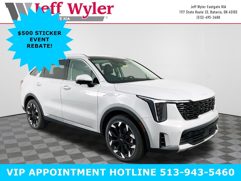 Wolf Gray 2026 Kia Sorento SX 2.5L I4 DGI Turbocharged DOHC 16V LEV3-SULEV30 281hp FWD 8 Speed Dual Clutch 20/29 City/Highway MPG Jeff Wyler Eastgate Auto Mall is proud to offer this wonderful 2026 Kia Sorento SX in Wolf Gray. Well equipped with: 12 Speakers, 3rd row seats: split-bench, 4-Wheel Disc Brakes, ABS brakes, Air Conditioning, Alloy wheels, AM/FM radio: SiriusXM, Apple CarPlay & Android Auto, Auto High-beam Headlights, Auto-dimming Rear-View mirror, Automatic temperature control, Brake assist, Bumpers: body-color, Carpeted Floor Mats, Delay-off headlights, Driver door bin, Driver vanity mirror, Dual front impact airbags, Dual front side impact airbags, Electronic Stability Control, Emergency communication system: 911 Connect, Exterior Parking Camera Rear, Four wheel independent suspension, Front anti-roll bar, Front Bucket Seats, Front Center Armrest, Front dual zone A/C, Front fog lights, Front reading lights, Fully automatic headlights, Garage door transmitter: HomeLink, Heated & Ventilated Front Bucket Seats, Heated door mirrors, Heated front seats, Heated steering wheel, Illuminated entry, Knee airbag, Leather Shift Knob, Leather steering wheel, Low tire pressure warning, Navigation System, Occupant sensing airbag, Outside temperature display, Overhead airbag, Overhead console, Panic alarm, Passenger door bin, Passenger vanity mirror, Power door mirrors, Power driver seat, Power Liftgate, Power moonroof, Power passenger seat, Power steering, Power windows, Radio data system, Radio: AM/FM Bose Premium Audio System, Rain sensing wipers, Rear anti-roll bar, Rear reading lights, Rear side impact airbag, Rear window defroster, Rear window wiper, Remote keyless entry, Security system, Speed control, Speed-sensing steering, Split folding rear seat, Spoiler, Steering wheel mounted audio controls, SynTex Artificial Leather Seat Trim, Tachometer, Telescoping steering wheel, Tilt steering wheel, Traction control, Trip computer, Turn signal indicator mirrors, Variably intermittent wipers, Ventilated front seats, and Wheels: 20" Machine-Finished Gloss Black Alloy. 20/29 City/Highway MPG Price includes: $500 - Sticker Sales Event Retail Bonus Cash. Exp. 01/02/2026