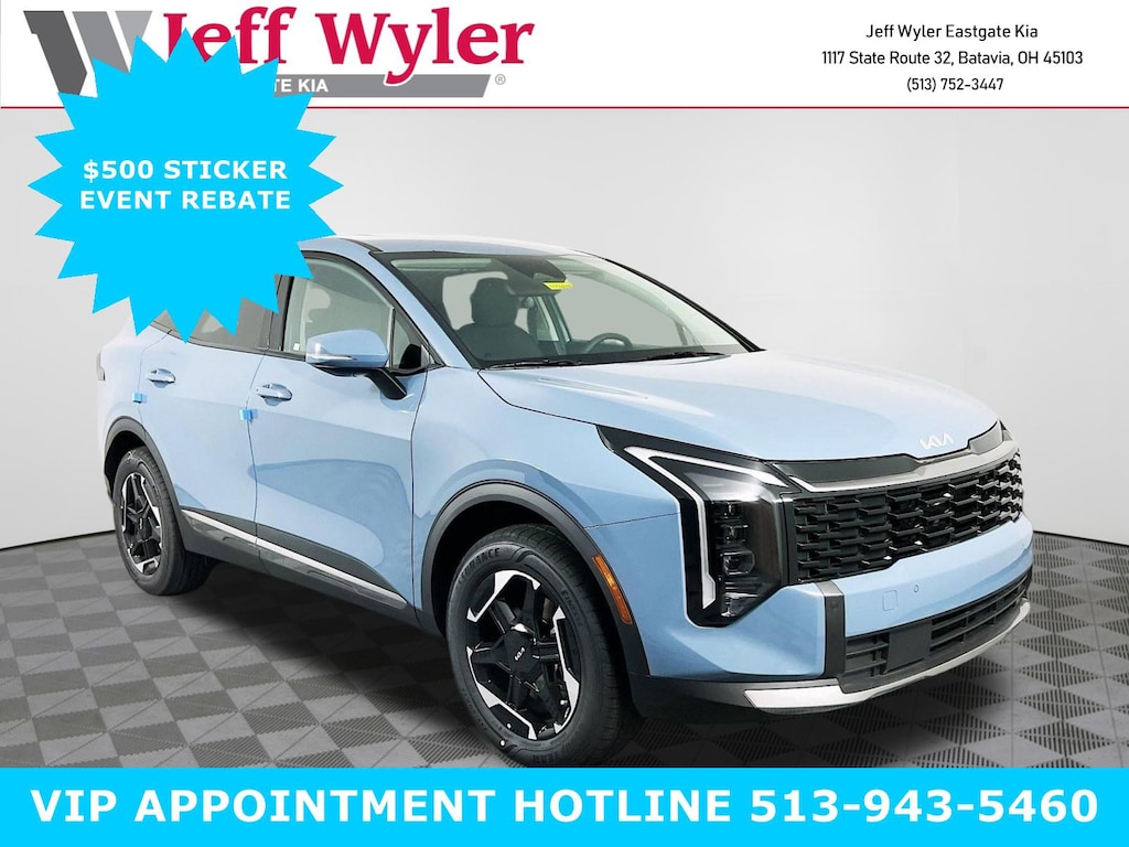 Heritage Blue 2026 Kia Sportage Hybrid S 1.6L Turbo GDI 4-Cylinder AWD 6-Speed Automatic Jeff Wyler Eastgate Auto Mall is excited to offer this fantastic-looking 2026 Kia Sportage Hybrid S in Heritage Blue. Well equipped with: 4-Wheel Disc Brakes, 6 Speakers, ABS brakes, Air Conditioning, All Weather Floor Mats, Alloy wheels, Auto High-beam Headlights, Automatic temperature control, Brake assist, Bumpers: body-color, Cloth Seat Trim, Delay-off headlights, Driver door bin, Driver vanity mirror, Dual front impact airbags, Dual front side impact airbags, Electronic Stability Control, Emergency communication system, Four wheel independent suspension, Front anti-roll bar, Front Bucket Seats, Front Center Armrest, Front dual zone A/C, Fully automatic headlights, Heated door mirrors, Heated Front Bucket Seats, Heated front seats, Illuminated entry, Leather steering wheel, Low tire pressure warning, Occupant sensing airbag, Outside temperature display, Overhead airbag, Overhead console, Panic alarm, Passenger door bin, Passenger vanity mirror, Power door mirrors, Power driver seat, Power steering, Power windows, Radio: AM/FM/HD Audio System, Rain sensing wipers, Rear anti-roll bar, Rear seat center armrest, Rear side impact airbag, Rear window defroster, Rear window wiper, Remote keyless entry, Security system, Speed control, Speed-sensing steering, Split folding rear seat, Spoiler, Steering wheel mounted audio controls, Tachometer, Telescoping steering wheel, Tilt steering wheel, Traction control, Trip computer, Turn signal indicator mirrors, Variably intermittent wipers, and Wheels: 18" x 7.5J Dark Finish Alloy. Price includes: $500 - Sticker Sales Event Retail Bonus Cash. Exp. 12/01/2025
