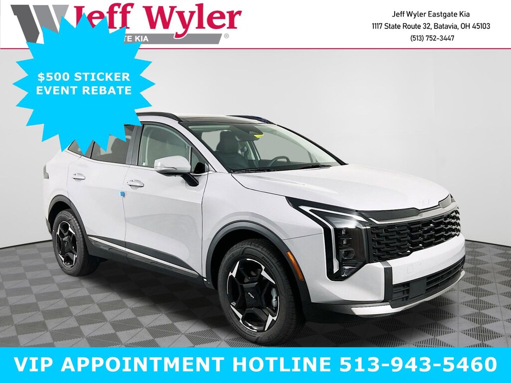 Wolf Gray 2026 Kia Sportage Hybrid EX 1.6L Turbo GDI 4-Cylinder AWD 6-Speed Automatic 35/36 City/Highway MPG Jeff Wyler Eastgate Auto Mall is delighted to offer this fantastic 2026 Kia Sportage Hybrid EX in Wolf Gray. Well equipped with: EX Panoramic Sunroof Package (LED Interior Lighting and Panoramic Sunroof), 4-Wheel Disc Brakes, 6 Speakers, ABS brakes, Air Conditioning, All Weather Floor Mats, Alloy wheels, Auto High-beam Headlights, Automatic temperature control, Brake assist, Bumpers: body-color, Delay-off headlights, Driver door bin, Driver vanity mirror, Dual front impact airbags, Dual front side impact airbags, Electronic Stability Control, Emergency communication system, Four wheel independent suspension, Front anti-roll bar, Front Bucket Seats, Front Center Armrest, Front dual zone A/C, Fully automatic headlights, Heated door mirrors, Heated Front Bucket Seats, Heated front seats, Illuminated entry, Leather steering wheel, Low tire pressure warning, Occupant sensing airbag, Outside temperature display, Overhead airbag, Overhead console, Panic alarm, Passenger door bin, Passenger vanity mirror, Power door mirrors, Power driver seat, Power Liftgate, Power steering, Power windows, Radio: AM/FM/HD Audio System, Rain sensing wipers, Rear anti-roll bar, Rear seat center armrest, Rear side impact airbag, Rear window defroster, Rear window wiper, Remote keyless entry, Security system, Speed control, Speed-sensing steering, Split folding rear seat, Spoiler, Steering wheel mounted audio controls, SynTex Leatherette Seat Trim, Tachometer, Telescoping steering wheel, Tilt steering wheel, Traction control, Trip computer, Turn signal indicator mirrors, Variably intermittent wipers, and Wheels: 18" x 7.5J Machined Alloy. 35/36 City/Highway MPG Price includes: $500 - Sticker Sales Event Retail Bonus Cash. Exp. 12/01/2025