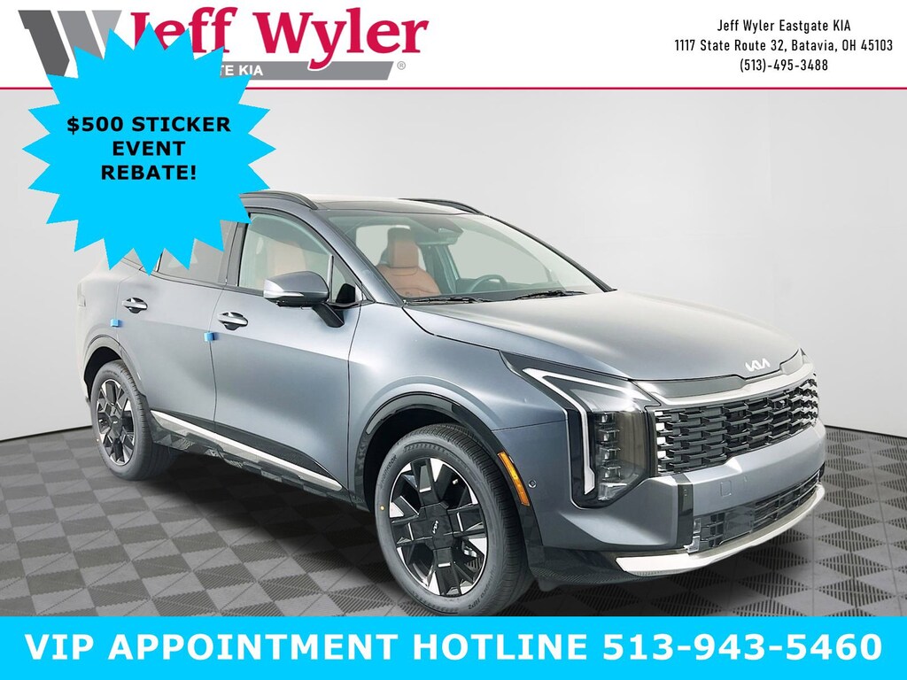 Shadow Matte Gray 2026 Kia Sportage Hybrid SX-Prestige 1.6L Turbo GDI 4-Cylinder AWD 6-Speed Automatic 35/36 City/Highway MPG Jeff Wyler Eastgate Auto Mall is delighted to offer this gorgeous 2026 Kia Sportage Hybrid SX-Prestige in Shadow Matte Gray. Well equipped with: Carmine Red Interior Color Package, 4-Wheel Disc Brakes, 8 Speakers, ABS brakes, Air Conditioning, Alloy wheels, AM/FM radio: SiriusXM, Auto High-beam Headlights, Automatic temperature control, Brake assist, Bumpers: body-color, Carpeted Floor Mats, Compass, Delay-off headlights, Driver door bin, Driver vanity mirror, Dual front impact airbags, Dual front side impact airbags, Electronic Stability Control, Emergency communication system, Four wheel independent suspension, Front anti-roll bar, Front Bucket Seats, Front Center Armrest, Front dual zone A/C, Front fog lights, Front reading lights, Fully automatic headlights, harman/kardon® Speakers, Heated and Ventilated Front Bucket Seats, Heated door mirrors, Heated front seats, Heated steering wheel, Illuminated entry, Leather steering wheel, Low tire pressure warning, Memory seat, Navigation System, Occupant sensing airbag, Outside temperature display, Overhead airbag, Overhead console, Panic alarm, Passenger door bin, Passenger vanity mirror, Power door mirrors, Power driver seat, Power Liftgate, Power moonroof, Power passenger seat, Power steering, Power windows, Radio: AM/FM/HD Premium Audio System, Rain sensing wipers, Rear anti-roll bar, Rear reading lights, Rear seat center armrest, Rear side impact airbag, Rear window defroster, Rear window wiper, Remote keyless entry, Security system, Speed control, Speed-sensing steering, Split folding rear seat, Spoiler, Steering wheel mounted audio controls, Syntex Premium Leatherette Seat Trim, Tachometer, Telescoping steering wheel, Tilt steering wheel, Traction control, Trip computer, Turn signal indicator mirrors, Variably intermittent wipers, Ventilated front seats, and Wheels: 19" x 7.5J Alloy. 35/36 City/Highway MPG