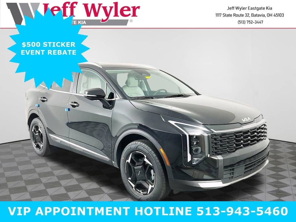 Fusion Black 2026 Kia Sportage Hybrid EX 1.6L Turbo GDI 4-Cylinder AWD 6-Speed Automatic 35/36 City/Highway MPG Jeff Wyler Eastgate Auto Mall is pumped up to offer this charming 2026 Kia Sportage Hybrid EX in Fusion Black. Well equipped with: 4-Wheel Disc Brakes, 6 Speakers, ABS brakes, Air Conditioning, Alloy wheels, Auto High-beam Headlights, Automatic temperature control, Brake assist, Bumpers: body-color, Carpeted Floor Mats, Delay-off headlights, Driver door bin, Driver vanity mirror, Dual front impact airbags, Dual front side impact airbags, Electronic Stability Control, Emergency communication system, Four wheel independent suspension, Front anti-roll bar, Front Bucket Seats, Front Center Armrest, Front dual zone A/C, Fully automatic headlights, Heated door mirrors, Heated Front Bucket Seats, Heated front seats, Illuminated entry, Leather steering wheel, Low tire pressure warning, Occupant sensing airbag, Outside temperature display, Overhead airbag, Overhead console, Panic alarm, Passenger door bin, Passenger vanity mirror, Power door mirrors, Power driver seat, Power Liftgate, Power steering, Power windows, Radio: AM/FM/HD Audio System, Rain sensing wipers, Rear anti-roll bar, Rear seat center armrest, Rear side impact airbag, Rear window defroster, Rear window wiper, Remote keyless entry, Security system, Speed control, Speed-sensing steering, Split folding rear seat, Spoiler, Steering wheel mounted audio controls, SynTex Leatherette Seat Trim, Tachometer, Telescoping steering wheel, Tilt steering wheel, Traction control, Trip computer, Turn signal indicator mirrors, Variably intermittent wipers, and Wheels: 18" x 7.5J Machined Alloy. 35/36 City/Highway MPG Price includes: $500 - Sticker Sales Event Retail Bonus Cash. Exp. 12/01/2025