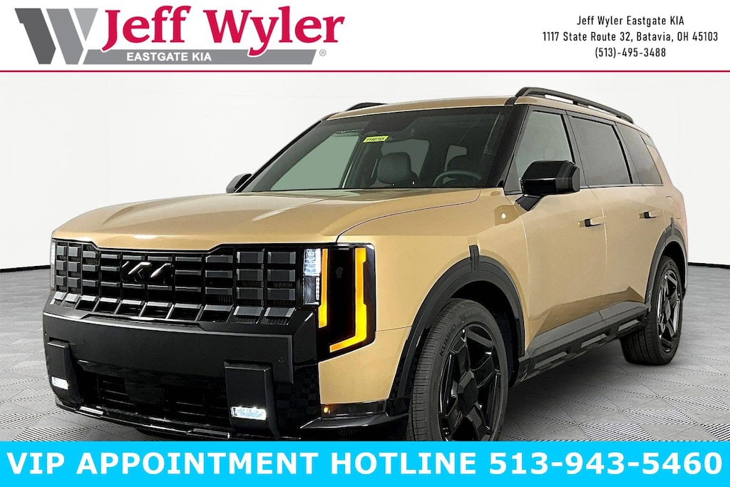 Terrain Brown 2027 Kia Telluride X-Line EX 2.5L I4 DGI Turbocharged DOHC 16V LEV3-SULEV30 274hp AWD 8-Speed Automatic Jeff Wyler Eastgate Auto Mall is excited to offer this wonderful-looking 2027 Kia Telluride X-Line EX in Terrain Brown. Well equipped with: 3rd row seats: split-bench, 4-Wheel Disc Brakes, 8 Speakers, ABS brakes, Air Conditioning, Alloy wheels, AM/FM radio: SiriusXM, Apple CarPlay & Android Auto, Auto High-beam Headlights, Auto-Dimming Mirror with HomeLink (PnP), Auto-dimming Rear-View mirror, Auto-leveling suspension, Automatic temperature control, Brake assist, Bumpers: body-color, Carpeted Floor Mats, Compass, Delay-off headlights, Driver door bin, Driver vanity mirror, Dual front impact airbags, Dual front side impact airbags, Electronic Stability Control, Emergency communication system: 911 Connect, Exterior Parking Camera Rear, Four wheel independent suspension, Front anti-roll bar, Front Bucket Seats, Front Center Armrest, Front dual zone A/C, Front reading lights, Fully automatic headlights, Heated and Ventilated Front Bucket Seats, Heated door mirrors, Heated front seats, Heated steering wheel, Illuminated entry, Knee airbag, Low tire pressure warning, Navigation System, Occupant sensing airbag, Outside temperature display, Overhead airbag, Overhead console, Panic alarm, Passenger door bin, Passenger vanity mirror, Power door mirrors, Power driver seat, Power Liftgate, Power moonroof, Power passenger seat, Power steering, Power windows, Radio data system, Radio: AM/FM Display Audio System, Rear air conditioning, Rear anti-roll bar, Rear reading lights, Rear side impact airbag, Rear window defroster, Rear window wiper, Reclining 3rd row seat, Remote keyless entry, Security system, Speed control, Speed-sensing steering, Split folding rear seat, Spoiler, Steering wheel mounted audio controls, SynTex Seat Trim, Tachometer, Telescoping steering wheel, Tilt steering wheel, Traction control, Trip computer, Turn signal indicator mirrors, Variably intermittent wipers, Ventilated front seats, and Wheels: 21" x 8" X-LINE Exclusive Type An Alloy.