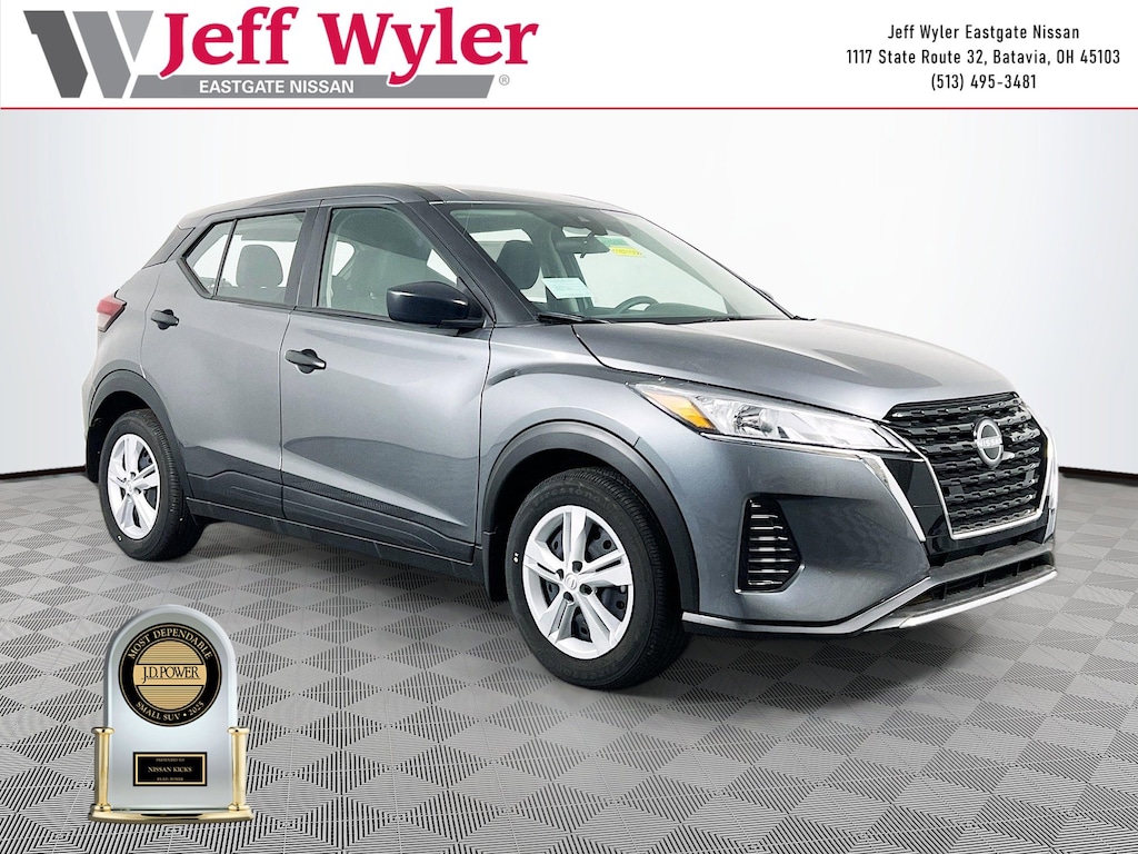 Gun Metallic 2025 Nissan Kicks Play S 1.6L 4-Cylinder DOHC 16V FWD CVT with Xtronic 31/36 City/Highway MPG Jeff Wyler Eastgate Auto Mall is proud to offer this handsome 2025 Nissan Kicks Play S in Gun Metallic. Well equipped with: 6 Speakers, ABS brakes, Air Conditioning, AM/FM radio, Auto High-beam Headlights, Blind Spot Warning, Brake assist, Driver door bin, Driver vanity mirror, Driver's Seat Mounted Armrest, Dual front impact airbags, Dual front side impact airbags, Electronic Stability Control, Front anti-roll bar, Front Bucket Seats, Front reading lights, Front wheel independent suspension, Fully automatic headlights, Illuminated entry, Knee airbag, Low tire pressure warning, Occupant sensing airbag, Outside temperature display, Overhead airbag, Panic alarm, Passenger door bin, Passenger vanity mirror, Power door mirrors, Power steering, Power windows, Radio data system, Rear Parking Sensors, Rear reading lights, Rear side impact airbag, Rear window defroster, Rear window wiper, Remote keyless entry, Speed control, Split folding rear seat, Sport steering wheel, Steering wheel mounted audio controls, Tachometer, Telescoping steering wheel, Tilt steering wheel, Traction control, Trip computer, and Variably intermittent wipers. 31/36 City/Highway MPG