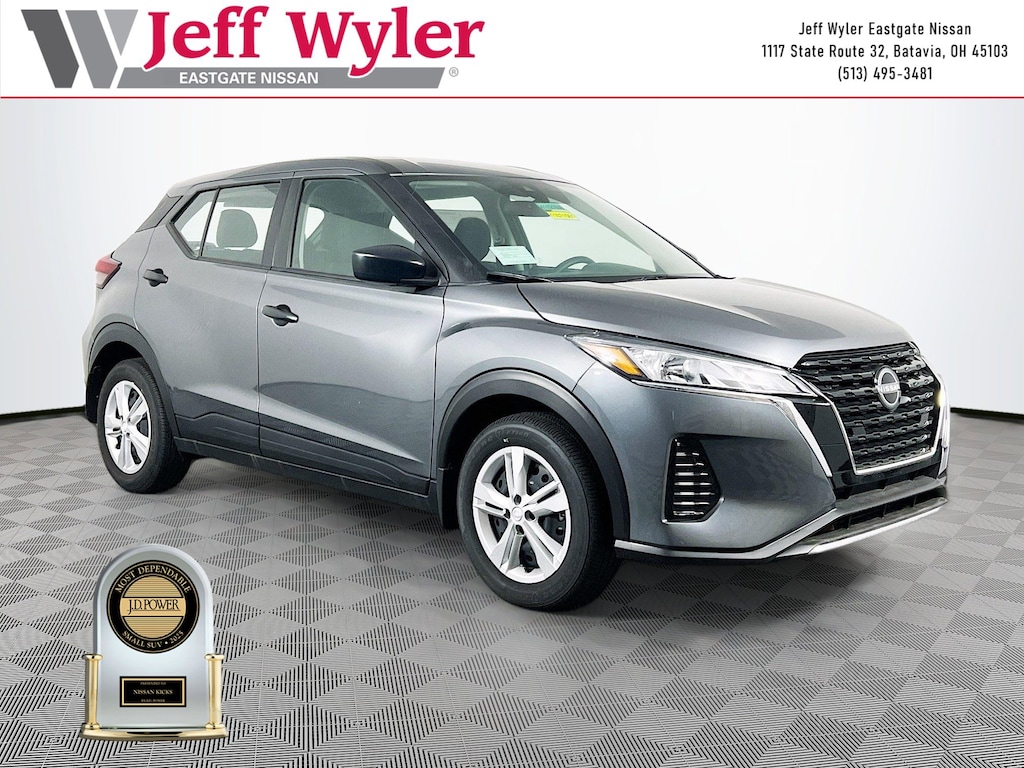 Gun Metallic 2025 Nissan Kicks Play S 1.6L 4-Cylinder DOHC 16V FWD CVT with Xtronic 31/36 City/Highway MPG Jeff Wyler Eastgate Auto Mall is very proud to offer this charming-looking 2025 Nissan Kicks Play S in Gun Metallic. Well equipped with: 6 Speakers, ABS brakes, Air Conditioning, AM/FM radio, Auto High-beam Headlights, Blind Spot Warning, Brake assist, Driver door bin, Driver vanity mirror, Driver's Seat Mounted Armrest, Dual front impact airbags, Dual front side impact airbags, Electronic Stability Control, Front anti-roll bar, Front Bucket Seats, Front reading lights, Front wheel independent suspension, Fully automatic headlights, Illuminated entry, Knee airbag, Low tire pressure warning, Occupant sensing airbag, Outside temperature display, Overhead airbag, Panic alarm, Passenger door bin, Passenger vanity mirror, Power door mirrors, Power steering, Power windows, Radio data system, Rear Parking Sensors, Rear reading lights, Rear side impact airbag, Rear window defroster, Rear window wiper, Remote keyless entry, Speed control, Split folding rear seat, Sport steering wheel, Steering wheel mounted audio controls, Tachometer, Telescoping steering wheel, Tilt steering wheel, Traction control, Trip computer, and Variably intermittent wipers. 31/36 City/Highway MPG
