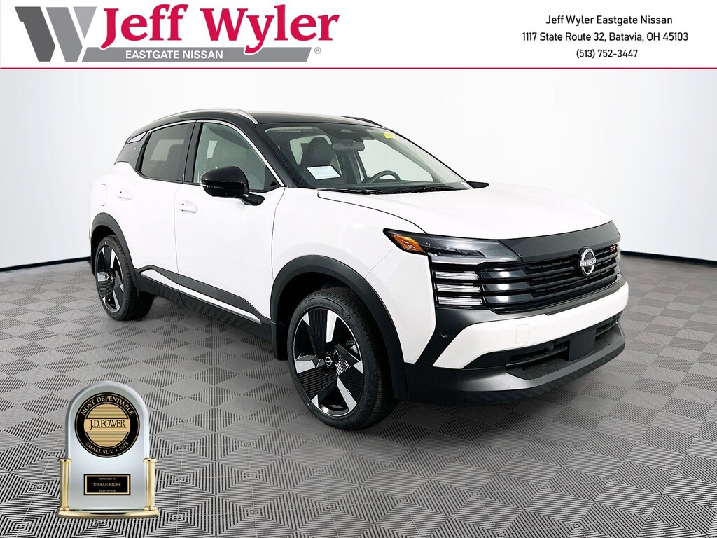 Aspen White Tricoat/Super Black 2025 Nissan Kicks SR 2.0L DOHC AWD CVT with Xtronic 27/34 City/Highway MPG Jeff Wyler Eastgate Auto Mall is honored to offer this terrific-looking 2025 Nissan Kicks SR in Aspen White Tricoat/Super Black. Well equipped with: Illumination Package (Illuminated Cargo Scuff Plate and Illuminated Kickplates), 17" Alloy Wheels, 19" Alloy Wheels, 2-Tone Premium Paint, 4-Wheel Disc Brakes, 6 Speakers, ABS brakes, Air Conditioning, Alloy wheels, AM/FM radio: Sirius, Auto High-beam Headlights, Automatic temperature control, AWD Cargo Mat, Brake assist, Bumpers: body-color, Carpeted Floor Mats, Delay-off headlights, Driver door bin, Driver vanity mirror, Dual front impact airbags, Dual front side impact airbags, Electronic Stability Control, Exterior Ground Lighting w/Logo, Four wheel independent suspension, Front anti-roll bar, Front Bucket Seats, Front Center Armrest, Front reading lights, Fully automatic headlights, Heated door mirrors, Illuminated entry, Knee airbag, Leather Shift Knob, Leather steering wheel, Low tire pressure warning, Occupant sensing airbag, Outside temperature display, Overhead airbag, Overhead console, Panic alarm, Passenger door bin, Passenger vanity mirror, Power door mirrors, Power steering, Power windows, Radio data system, Radio: AM/FM Audio System, Rear anti-roll bar, Rear reading lights, Rear seat center armrest, Rear side impact airbag, Rear window defroster, Rear window wiper, Remote keyless entry, Security system, Speed control, Speed-sensing steering, Splash Guards, Split folding rear seat, Spoiler, Sport Cloth/Leatherette Seat Trim, Sport steering wheel, Steering wheel mounted audio controls, Tachometer, Telescoping steering wheel, Tilt steering wheel, Traction control, Trip computer, Turn signal indicator mirrors, Variably intermittent wipers, and Wireless Apple CarPlay/Wireless Android Auto. 27/34 City/Highway MPG Price includes: $1000 - Nissan MY25 New Kicks (SV and SR) Retail/Lease Bonus Cash. Exp. 01/05/2026 $500 - Nissan MWR MY25 New Kicks Bonus Cash - December. Exp. 01/05/2026