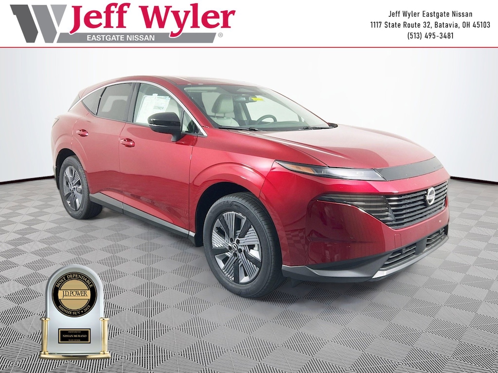 Priced below KBB Fair Purchase Price! Scarlet Ember Tintcoat 2025 Nissan Murano SL I4 AWD 9-Speed Automatic 21/27 City/Highway MPG Jeff Wyler Eastgate Auto Mall is very proud to offer this gorgeous 2025 Nissan Murano SL in Scarlet Ember Tintcoat. Well equipped with: Cargo Package (3-Position Cargo Area Protector, Cargo Net, First Aid Kit, and Retractable Cargo Cover), 10 Speakers, 20" Alloy Wheels, 4-Wheel Disc Brakes, ABS brakes, Air Conditioning, Alloy wheels, AM/FM radio: SiriusXM w/360L, Auto High-beam Headlights, Auto-dimming Rear-View mirror, Automatic temperature control, Brake assist, Bumpers: body-color, Carpeted Floor & Cargo Mats, Child-Seat-Sensing Airbag, Compass, Delay-off headlights, Driver door bin, Driver vanity mirror, Dual front impact airbags, Dual front side impact airbags, Electronic Stability Control, Emergency communication system: NissanConnect Services, Four wheel independent suspension, Front anti-roll bar, Front Bucket Seats, Front Center Armrest, Front dual zone A/C, Front reading lights, Fully automatic headlights, Garage door transmitter: myQ Connected Garage, Grained Splash Guards, Heated door mirrors, Heated Front Bucket Seats, Heated front seats, Heated steering wheel, Illuminated entry, Knee airbag, Low tire pressure warning, Memory seat, Navigation system: NissanConnect with Navigation and Services, Occupant sensing airbag, Outside temperature display, Overhead airbag, Overhead console, Panic alarm, Passenger door bin, Passenger vanity mirror, Power door mirrors, Power driver seat, Power Liftgate, Power moonroof: Panoramic, Power passenger seat, Power steering, Power windows, Premium Paint, PVC (Leatherette) Seat Trim, Radio data system, Radio: NissanConnect w/Hybrid Radio, Rear anti-roll bar, Rear reading lights, Rear seat center armrest, Rear side impact airbag, Rear window defroster, Rear window wiper, Remote keyless entry, Security system, Speed control, Speed-Sensitive Wipers, Split folding rear seat, Spoiler, Steering wheel mounted audio controls, Tachometer, Telescoping steering wheel, Tilt steering wheel, Traction control, Trip computer, Turn signal indicator mirrors, Variably intermittent wipers, and Wireless Apple CarPlay/Wireless Android Auto. 21/27 City/Highway MPG Price includes: $5000 - Nissan Customer Cash. Exp. 02/02/2026
