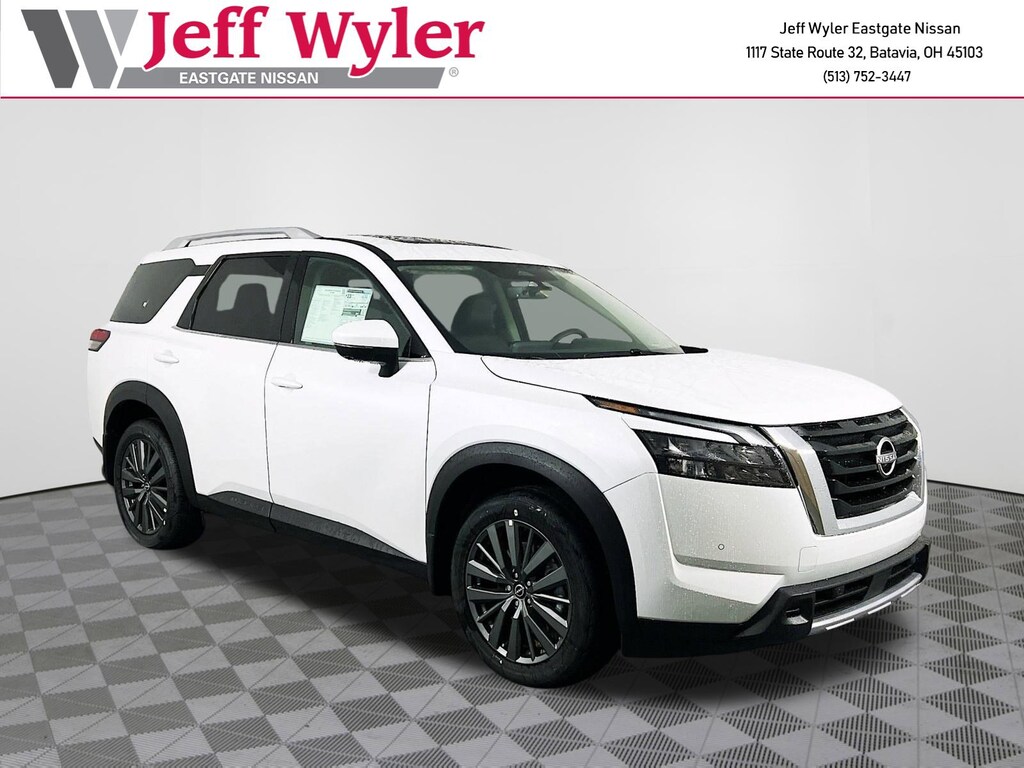 Priced below KBB Fair Purchase Price! Everest White Pearl Tricoat 2025 Nissan Pathfinder SL 3.5L V6 DOHC 4WD 9-Speed Automatic 21/27 City/Highway MPG Jeff Wyler Eastgate Auto Mall is proud to offer this beautiful-looking 2025 Nissan Pathfinder SL in Everest White Pearl Tricoat. Well equipped with: 3rd row seats: bench, 4-Wheel Disc Brakes, 6 Speakers, ABS brakes, Air Conditioning, Alloy wheels, AM/FM radio: SiriusXM, Auto High-beam Headlights, Auto-dimming Rear-View mirror, Automatic temperature control, Brake assist, Bumpers: body-color, Delay-off headlights, Driver door bin, Driver vanity mirror, Dual front impact airbags, Dual front side impact airbags, Electronic Stability Control, Emergency communication system, Exterior Parking Camera Rear, Four wheel independent suspension, Front anti-roll bar, Front Bucket Seats, Front Center Armrest, Front dual zone A/C, Front reading lights, Fully automatic headlights, Garage door transmitter: HomeLink, Heated door mirrors, Heated Front Bucket Seats, Heated front seats, Heated steering wheel, Illuminated entry, Knee airbag, Leather steering wheel, Leather-Appointed Seating Surfaces, Low tire pressure warning, Navigation system: NissanConnect with Navigation and Services, NissanConnect featuring Apple CarPlay and Android Auto, NissanConnect w/Navigation & Services, Occupant sensing airbag, Outside temperature display, Overhead airbag, Overhead console, Panic alarm, Passenger door bin, Passenger vanity mirror, Power door mirrors, Power driver seat, Power Liftgate, Power passenger seat, Power steering, Power windows, Radio data system, Radio: AM/FM Audio System, Rear air conditioning, Rear anti-roll bar, Rear reading lights, Rear seat center armrest, Rear side impact airbag, Rear window defroster, Rear window wiper, Reclining 3rd row seat, Remote keyless entry, Security system, Speed control, Speed-sensing steering, Split folding rear seat, Spoiler, Steering wheel mounted audio controls, Tachometer, Telescoping steering wheel, Tilt steering wheel, Traction control, Trip computer, Turn signal indicator mirrors, Variably intermittent wipers, and Wheels: 18" x 8J Machined Alloy. 21/27 City/Highway MPG Price includes: $5000 - Nissan Customer Cash. Exp. 12/01/2025