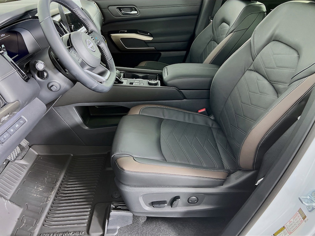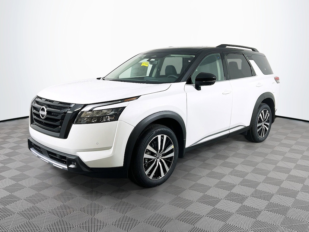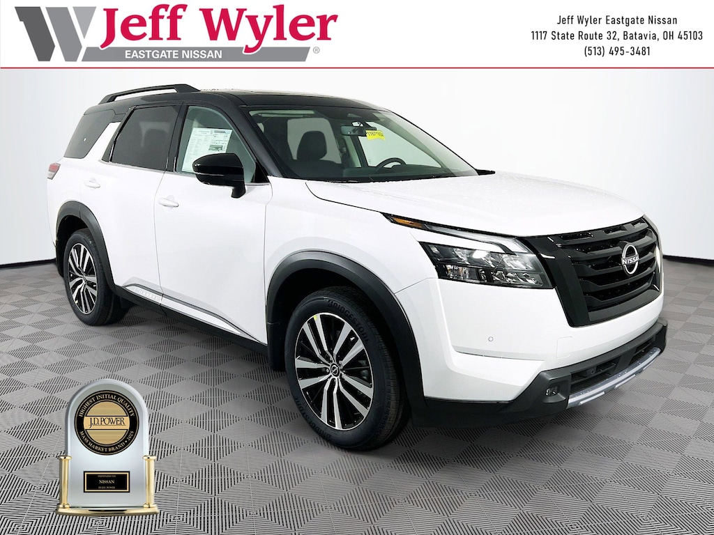 Priced below KBB Fair Purchase Price! Everest White Pearl/Black 2025 Nissan Pathfinder Platinum 3.5L V6 DOHC 4WD 9-Speed Automatic 20/25 City/Highway MPG Jeff Wyler Eastgate Auto Mall is proud to offer this good-looking 2025 Nissan Pathfinder Platinum in Everest White Pearl/Black. Well equipped with: Black Appearance Package (Black Grille and Black Liftgate Emblems), 13 Speakers, 3rd row seats: bench, 4-Wheel Disc Brakes, ABS brakes, Air Conditioning, Alloy wheels, AM/FM radio: SiriusXM, Auto High-beam Headlights, Auto tilt-away steering wheel, Auto-dimming Rear-View mirror, Automatic temperature control, Bodyside moldings, Bose Premium Audio System, Brake assist, Bumpers: body-color, Climate Controlled Front Bucket Seats, Delay-off headlights, Driver door bin, Driver vanity mirror, Dual front impact airbags, Dual front side impact airbags, Electronic Stability Control, Emergency communication system, Exterior Parking Camera Rear, Four wheel independent suspension, Front anti-roll bar, Front Bucket Seats, Front Center Armrest, Front dual zone A/C, Front reading lights, Fully automatic headlights, Garage door transmitter: HomeLink, Heads-Up Display, Heated door mirrors, Heated front seats, Heated rear seats, Heated steering wheel, Illuminated entry, Knee airbag, Leather steering wheel, LED Fog Lamps, Low tire pressure warning, Memory seat, Navigation system: NissanConnect with Navigation and Services, NissanConnect featuring Apple CarPlay and Android Auto, NissanConnect with Navigation and Services, Occupant sensing airbag, Outside temperature display, Overhead airbag, Overhead console, Panic alarm, Passenger door bin, Passenger vanity mirror, Power door mirrors, Power driver seat, Power Liftgate, Power moonroof, Power passenger seat, Power steering, Power windows, Premium Paint and 2-Tone Roof, Radio data system, Radio: AM/FM Audio System, Rain sensing wipers, Rear air conditioning, Rear anti-roll bar, Rear reading lights, Rear seat center armrest, Rear side impact airbag, Rear window defroster, Rear window wiper, Reclining 3rd row seat, Remote keyless entry, Security system, Semi-Aniline Leather-Appointed Seating Surfaces, Speed control, Speed-sensing steering, Speed-Sensitive Wipers, Split folding rear seat, Spoiler, Steering wheel memory, Steering wheel mounted audio controls, Tachometer, Telescoping steering wheel, Tilt steering wheel, Traction control, Trip computer, Turn signal indicator mirrors, Variably intermittent wipers, Ventilated front seats, and Wheels: 20" x 8J Machined Alloy. Price includes: $5000 - Nissan Customer Cash. Exp. 01/05/2026