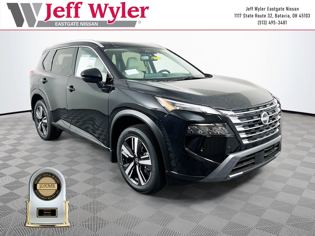 Super Black 2025 Nissan Rogue SL 1.5L DOHC AWD CVT with Xtronic 28/34 City/Highway MPG Jeff Wyler Eastgate Auto Mall is very proud to offer this wonderful-looking 2025 Nissan Rogue SL in Super Black. Well equipped with: SL Premium Package (Head-Up Display, Memory Driver Seat and Outside Mirrors, Motion-Activated Power Liftgate, Panoramic Moonroof, Rear Door Sunshades, Rear Personal Lights, Reverse Tilt-Down Outside Mirrors, and Tri-Zone Automatic Temperature Control), 4-Wheel Disc Brakes, 6 Speakers, ABS brakes, Air Conditioning, Alloy wheels, AM/FM radio: SiriusXM with 360L, Android Auto and Apple CarPlay, Auto High-beam Headlights, Auto-dimming Rear-View mirror, Automatic temperature control, Brake assist, Bumpers: body-color, Chrome Rear Bumper Protector, Delay-off headlights, Driver door bin, Driver vanity mirror, Dual front impact airbags, Dual front side impact airbags, Electronic Stability Control, Emergency communication system: NissanConnect Services, First Aid Kit, Floor Mats with 2-Piece Cargo Area Protector, Four wheel independent suspension, Front anti-roll bar, Front Bucket Seats, Front Center Armrest, Front dual zone A/C, Front reading lights, Fully automatic headlights, Garage door transmitter: myQ Connected Garage, Heated door mirrors, Heated Front Bucket Seats with 8-Way Power Driver Seat and 4-Way Power Passenger Seat, Heated steering wheel, Illuminated entry, Illuminated Kick Plates, Knee airbag, Leather-Appointed Seat Trim, Low tire pressure warning, Navigation system: NissanConnect with Navigation and Services, Occupant sensing airbag, Outside temperature display, Overhead airbag, Overhead console, Panic alarm, Passenger door bin, Passenger vanity mirror, Power door mirrors, Power driver seat, Power Liftgate, Power passenger seat, Power steering, Power windows, Radio data system, Radio: NissanConnect with Navigation and 6 Speakers, Rear anti-roll bar, Rear seat center armrest, Rear side impact airbag, Rear window defroster, Rear window wiper, Remote keyless entry, Security system, Speed control, Speed-sensing steering, Speed-Sensitive Wipers, Split folding rear seat, Spoiler, Steering wheel mounted audio controls, Tachometer, Telescoping steering wheel, Tilt steering wheel, Traction control, Trip computer, Turn signal indicator mirrors, USB Charging Cable Set - Nissan, Variably intermittent wipers, and Wheels: 19" Dark Painted Machine Finished Alloy. 28/34 City/Highway MPG