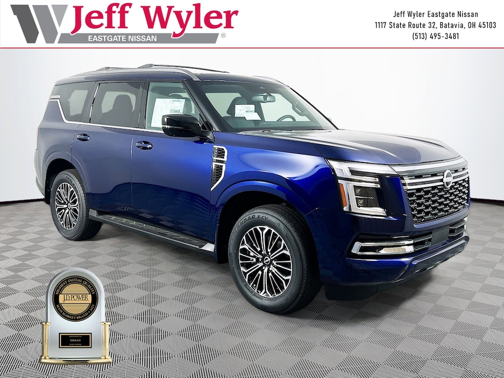 Deep Ocean Blue Pearl 2026 Nissan Armada SL 3.5L DOHC 4WD 9-Speed Automatic 16/19 City/Highway MPG Jeff Wyler Eastgate Auto Mall is proud to offer this superb-looking 2026 Nissan Armada SL in Deep Ocean Blue Pearl. Well equipped with: Captain's Chair Seat Package (2nd Row Center Console with Two Cupholders, 2nd Row Outboard Captain's Chairs with Armrests, and EZ Flex Second Row Seating System with One Touch Release), 12 Speakers, 3rd row seats: split-bench, 4-Wheel Disc Brakes, ABS brakes, Air Conditioning, Alloy wheels, AM/FM radio: SiriusXM w/360L, Anti-whiplash front head restraints, Apple CarPlay/Android Auto, Auto High-beam Headlights, Auto tilt-away steering wheel, Auto-dimming door mirrors, Auto-dimming Rear-View mirror, Auto-leveling suspension, Automatic temperature control, Brake assist, Bumpers: body-color, Carpeted Floor Mats with Captain Chairs, Center Front Spoiler, Compass, Cross Bars, Delay-off headlights, Driver door bin, Driver vanity mirror, Dual front impact airbags, Dual front side impact airbags, Electronic Stability Control, Emergency communication system: NissanConnect Services, Four wheel independent suspension, Front anti-roll bar, Front Bucket Seats, Front Center Armrest, Front dual zone A/C, Front reading lights, Fully automatic headlights, Garage door transmitter: myQ Connected Garage, Genuine wood dashboard insert, Heated door mirrors, Heated Front Bucket Seats, Heated front seats, Heated steering wheel, HVAC memory, Illuminated entry, Knee airbag, Leather steering wheel, Low tire pressure warning, Memory seat, Navigation system: Google Maps, Occupant sensing airbag, Outside temperature display, Overhead airbag, Overhead console, Panic alarm, Passenger door bin, Passenger vanity mirror, Power door mirrors, Power driver seat, Power Liftgate, Power passenger seat, Power steering, Power windows, Radio: NissanConnect with SiriusXM 360L, Rain sensing wipers, Rear air conditioning, Rear anti-roll bar, Rear Bumper Protector, Rear reading lights, Rear seat center armrest, Rear window defroster, Rear window wiper, Reclining 3rd row seat, Remote keyless entry, Security system, Speed control, Speed-sensing steering, Speed-Sensitive Wipers, Splash Guards, Split folding rear seat, Spoiler, Steering wheel memory, Steering wheel mounted audio controls, Tachometer, TailorFit Seat Trim, Telescoping steering wheel, Tilt steering wheel, Traction control, Trip computer, Turn signal indicator mirrors, Variably intermittent wipers, Voltmeter, and Wheels: 20" x 8.5J Machined and Painted Alloy.