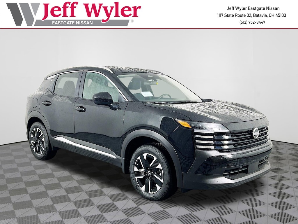 Super Black 2026 Nissan Kicks SV 2.0L DOHC AWD CVT with Xtronic 27/34 City/Highway MPG Jeff Wyler Eastgate Auto Mall is pleased to offer this handsome 2026 Nissan Kicks SV in Super Black. Well equipped with: Cold Weather Package (Heated Front Seats, Heated Mirrors, and Rear Floor Heater Ducts), SV Premium Package (Illuminated Driver & Passenger Sun Visors, Panoramic Moonroof, and Sunglass Holder), 17" Alloy Wheels, 4 Speakers, 4-Wheel Disc Brakes, ABS brakes, Air Conditioning, Alloy wheels, AM/FM radio, Auto High-beam Headlights, Automatic temperature control, Blind Spot Warning, Brake assist, Bumpers: body-color, Carpeted Floor Mats, Cloth Seat Trim, Driver door bin, Driver vanity mirror, Dual front impact airbags, Dual front side impact airbags, Electronic Stability Control, Emergency communication system, Exterior Parking Camera Rear, Four wheel independent suspension, Front anti-roll bar, Front Bucket Seats, Front Center Armrest, Front reading lights, Fully automatic headlights, Illuminated entry, Knee airbag, Low tire pressure warning, NissanConnect featuring Apple CarPlay and Android Auto, Occupant sensing airbag, Outside temperature display, Overhead airbag, Panic alarm, Panoramic Headliner Illumination, Passenger door bin, Passenger vanity mirror, Power door mirrors, Power steering, Power windows, Radio data system, Radio: AM/FM/SiriusXM Audio System, Rear anti-roll bar, Rear reading lights, Rear side impact airbag, Rear window defroster, Rear window wiper, Remote keyless entry, Security system, Speed control, Speed-sensing steering, Splash Guards, Split folding rear seat, Spoiler, Sport steering wheel, Steering wheel mounted audio controls, Tachometer, Telescoping steering wheel, Tilt steering wheel, Traction control, Trip computer, and Variably intermittent wipers. 27/34 City/Highway MPG Price includes: $1000 - Nissan Customer Cash. Exp. 12/01/2025 $500 - Nissan MWR MY26 New Kicks Black Friday Bonus Cash - November. Exp. 12/01/2025