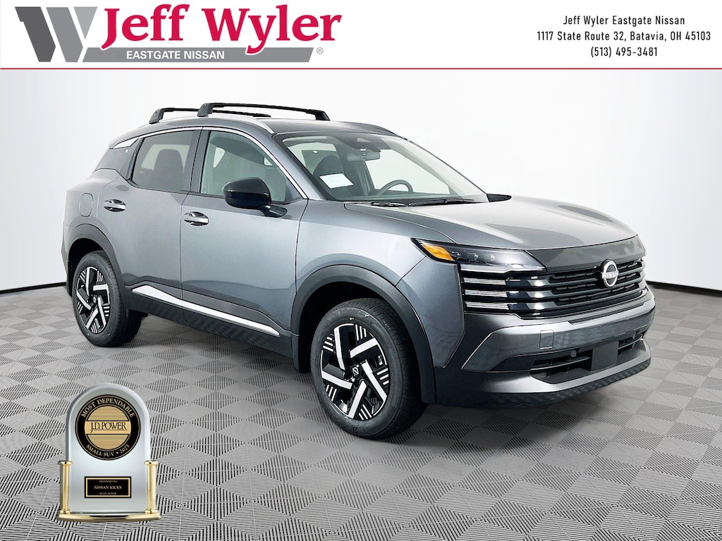 Gun Metallic 2026 Nissan Kicks SV 2.0L DOHC FWD CVT with Xtronic 28/35 City/Highway MPG Jeff Wyler Eastgate Auto Mall is excited to offer this outstanding 2026 Nissan Kicks SV in Gun Metallic. Well equipped with: Cold Weather Package (Heated Front Seats, Heated Mirrors, and Rear Floor Heater Ducts), SV Premium Package (Illuminated Driver & Passenger Sun Visors, Panoramic Moonroof, and Sunglass Holder), 4 Speakers, 4-Wheel Disc Brakes, ABS brakes, Air Conditioning, AM/FM radio, Auto High-beam Headlights, Automatic temperature control, Blind Spot Warning, Brake assist, Bumpers: body-color, Carpeted Floor Mats & Underfloor Protector, Cloth Seat Trim, Crossbars, Driver door bin, Driver vanity mirror, Dual front impact airbags, Dual front side impact airbags, Electronic Stability Control, Emergency communication system, Exterior Parking Camera Rear, Front anti-roll bar, Front Bucket Seats, Front Center Armrest, Front reading lights, Front wheel independent suspension, Fully automatic headlights, Illuminated entry, Knee airbag, Low tire pressure warning, NissanConnect featuring Apple CarPlay and Android Auto, Occupant sensing airbag, Outside temperature display, Overhead airbag, Panic alarm, Passenger door bin, Passenger vanity mirror, Power door mirrors, Power steering, Power windows, Radio data system, Radio: AM/FM/SiriusXM Audio System, Rear anti-roll bar, Rear reading lights, Rear side impact airbag, Rear window defroster, Rear window wiper, Remote keyless entry, Security system, Speed control, Speed-sensing steering, Splash Guards, Split folding rear seat, Spoiler, Sport steering wheel, Steering wheel mounted audio controls, Tachometer, Telescoping steering wheel, Tilt steering wheel, Traction control, Trip computer, Variably intermittent wipers, and Wheels: 17" Steel Flex w/Full Covers. 28/35 City/Highway MPG Price includes: $1000 - Nissan Customer Cash. Exp. 01/05/2026 $500 - Nissan MWR MY26 Kicks Bonus Cash - December. Exp. 01/05/2026