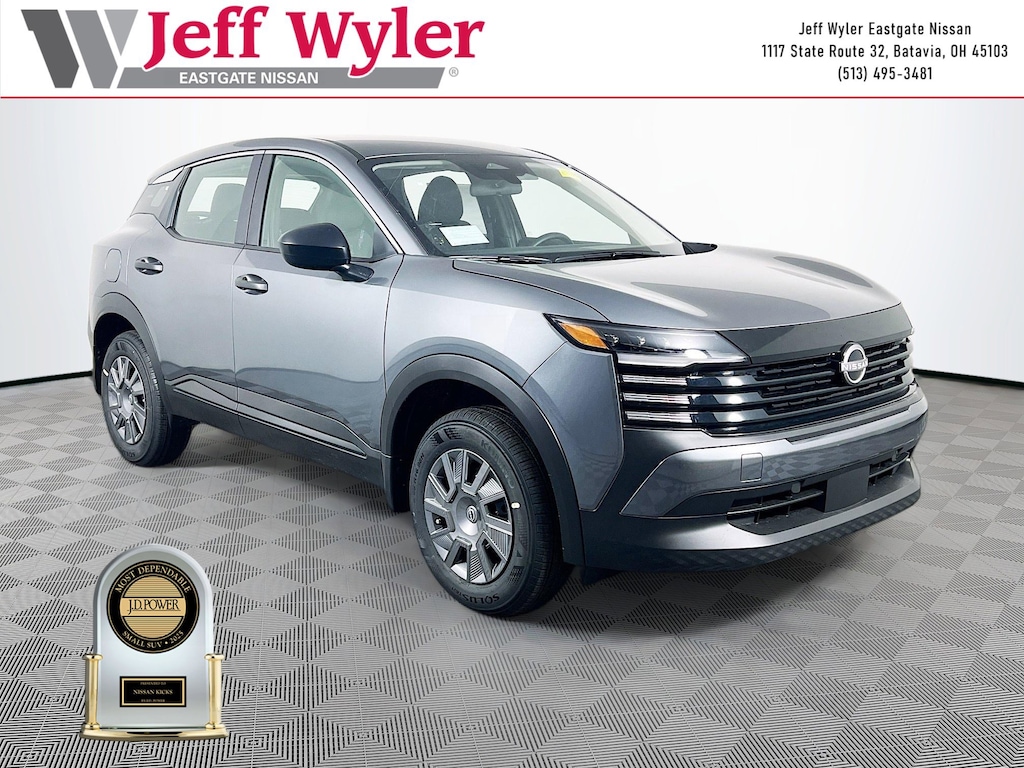 Gun Metallic 2026 Nissan Kicks S 2.0L DOHC FWD CVT with Xtronic 28/35 City/Highway MPG Jeff Wyler Eastgate Auto Mall is very proud to offer this fantastic 2026 Nissan Kicks S in Gun Metallic. Well equipped with: 16" Steel Wheels w/Full Covers, 4 Speakers, 4-Wheel Disc Brakes, ABS brakes, Air Conditioning, AM/FM radio, Auto High-beam Headlights, Blind Spot Warning, Brake assist, Bumpers: body-color, Carpeted Floor Mats & Cargo Mat, Cloth Seat Trim, Driver door bin, Driver vanity mirror, Driver's Seat Mounted Armrest, Dual front impact airbags, Dual front side impact airbags, Electronic Stability Control, Emergency communication system, Exterior Parking Camera Rear, Front anti-roll bar, Front Bucket Seats, Front reading lights, Front wheel independent suspension, Fully automatic headlights, Illuminated entry, Knee airbag, Low tire pressure warning, NissanConnect featuring Apple CarPlay and Android Auto, Occupant sensing airbag, Outside temperature display, Overhead airbag, Panic alarm, Passenger door bin, Passenger vanity mirror, Power door mirrors, Power steering, Power windows, Radio data system, Radio: AM/FM/SiriusXM Audio System, Rear anti-roll bar, Rear reading lights, Rear side impact airbag, Rear window defroster, Rear window wiper, Remote keyless entry, Security system, Speed control, Speed-sensing steering, Splash Guards, Split folding rear seat, Spoiler, Sport steering wheel, Steering wheel mounted audio controls, Tachometer, Telescoping steering wheel, Tilt steering wheel, Traction control, Trip computer, and Variably intermittent wipers. 28/35 City/Highway MPG Price includes: $500 - Nissan MWR MY26 Kicks Bonus Cash - December. Exp. 01/05/2026