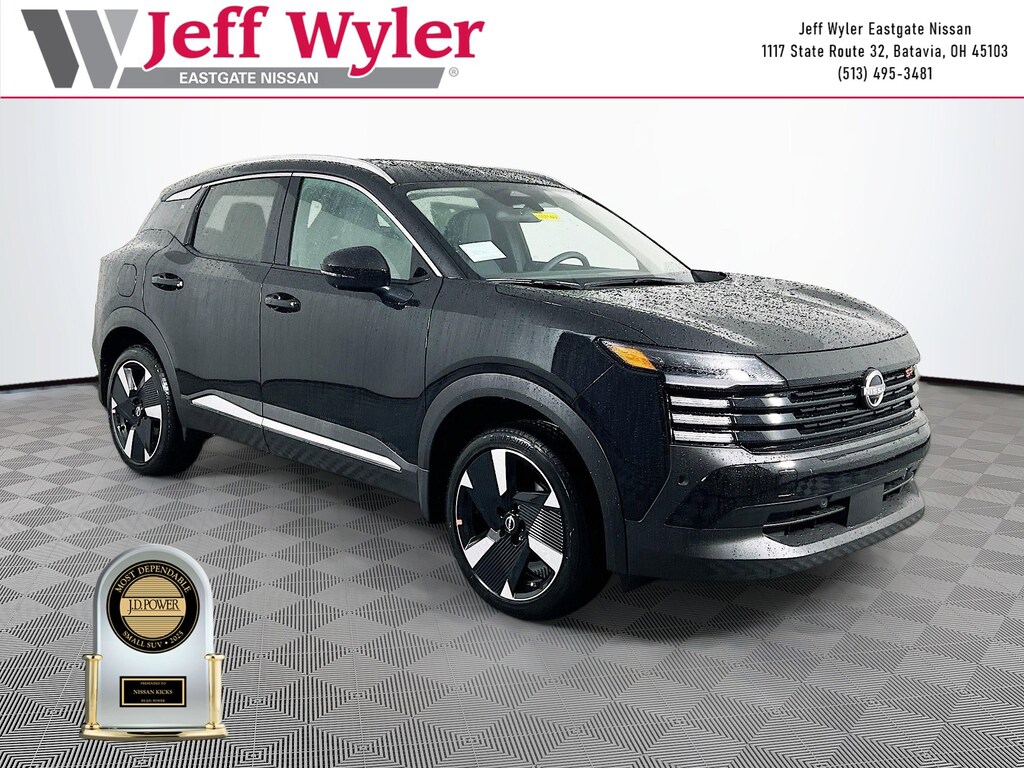 Super Black 2026 Nissan Kicks SR 2.0L DOHC FWD CVT with Xtronic 28/35 City/Highway MPG Jeff Wyler Eastgate Auto Mall is delighted to offer this charming 2026 Nissan Kicks SR in Super Black. Well equipped with: Cold Weather Package (Heated Front Seats, Heated Mirrors, and Rear Floor Heater Ducts), SR Premium Package (Bose 10 -Speaker Audio, Driver Seat-Mounted Supplemental Air Bag, Heated Steering Wheel, and Panoramic Moonroof), 17" Alloy Wheels, 19" Alloy Wheels, 4-Wheel Disc Brakes, 6 Speakers, ABS brakes, Air Conditioning, Alloy wheels, AM/FM radio, Auto High-beam Headlights, Automatic temperature control, Brake assist, Bumpers: body-color, Carpeted Floor Mats & Underfloor Protector, Delay-off headlights, Driver door bin, Driver vanity mirror, Dual front impact airbags, Dual front side impact airbags, Electronic Stability Control, Emergency communication system: NissanConnect Services, Exterior Parking Camera Rear, Front anti-roll bar, Front Bucket Seats, Front Center Armrest, Front reading lights, Front wheel independent suspension, Fully automatic headlights, Garage door transmitter: myQ Connected Garage, Illuminated entry, Knee airbag, Leather Shift Knob, Leather steering wheel, Low tire pressure warning, NissanConnect featuring Apple CarPlay and Android Auto, Occupant sensing airbag, Outside temperature display, Overhead airbag, Overhead console, Panic alarm, Passenger door bin, Passenger vanity mirror, Power door mirrors, Power steering, Power windows, Radio data system, Radio: AM/FM/SiriusXM Audio System, Rear anti-roll bar, Rear reading lights, Rear seat center armrest, Rear side impact airbag, Rear window defroster, Rear window wiper, Remote keyless entry, Security system, Speed control, Speed-sensing steering, Splash Guards, Split folding rear seat, Spoiler, Sport Leatherette w/Cloth Insert Seat Trim, Sport steering wheel, Steering wheel mounted audio controls, Tachometer, Telescoping steering wheel, Tilt steering wheel, Traction control, Trip computer, Turn signal indicator mirrors, and Variably intermittent wipers. 28/35 City/Highway MPG Price includes: $1000 - Nissan Customer Cash. Exp. 01/05/2026 $500 - Nissan MWR MY26 Kicks Bonus Cash - December. Exp. 01/05/2026
