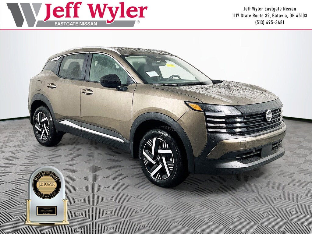 Canyon Bronze Metallic 2026 Nissan Kicks SV 2.0L DOHC FWD CVT with Xtronic 28/35 City/Highway MPG Jeff Wyler Eastgate Auto Mall is very proud to offer this attractive 2026 Nissan Kicks SV in Canyon Bronze Metallic. Well equipped with: 4 Speakers, 4-Wheel Disc Brakes, ABS brakes, Air Conditioning, AM/FM radio, Auto High-beam Headlights, Automatic temperature control, Blind Spot Warning, Brake assist, Bumpers: body-color, Carpeted Floor Mats & Underfloor Protector, Cloth Seat Trim, Driver door bin, Driver vanity mirror, Dual front impact airbags, Dual front side impact airbags, Electronic Stability Control, Emergency communication system, Exterior Parking Camera Rear, Front anti-roll bar, Front Bucket Seats, Front Center Armrest, Front reading lights, Front wheel independent suspension, Fully automatic headlights, Illuminated entry, Knee airbag, Low tire pressure warning, NissanConnect featuring Apple CarPlay and Android Auto, Occupant sensing airbag, Outside temperature display, Overhead airbag, Panic alarm, Passenger door bin, Passenger vanity mirror, Power door mirrors, Power steering, Power windows, Radio data system, Radio: AM/FM/SiriusXM Audio System, Rear anti-roll bar, Rear reading lights, Rear side impact airbag, Rear window defroster, Rear window wiper, Remote keyless entry, Security system, Speed control, Speed-sensing steering, Splash Guards, Split folding rear seat, Spoiler, Sport steering wheel, Steering wheel mounted audio controls, Tachometer, Telescoping steering wheel, Tilt steering wheel, Traction control, Trip computer, Variably intermittent wipers, and Wheels: 17" Steel Flex w/Full Covers. 28/35 City/Highway MPG Price includes: $1000 - Nissan Customer Cash. Exp. 01/05/2026 $500 - Nissan MWR MY26 Kicks Bonus Cash - December. Exp. 01/05/2026