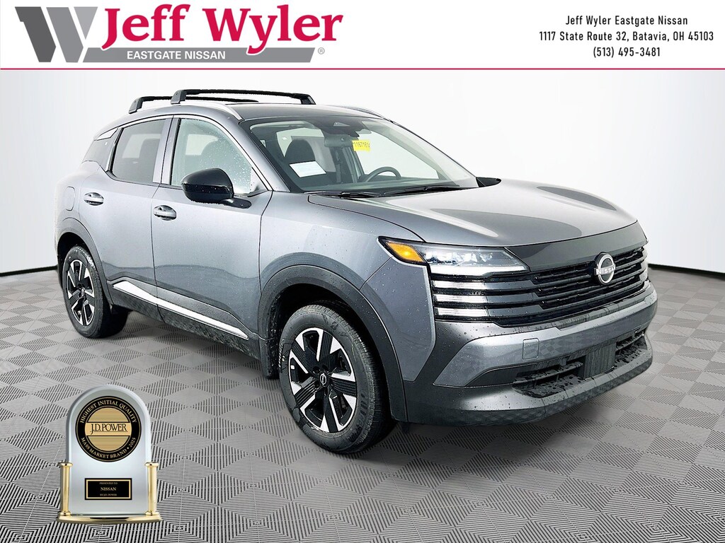 Gun Metallic 2026 Nissan Kicks SV 2.0L DOHC AWD CVT with Xtronic 27/34 City/Highway MPG Jeff Wyler Eastgate Auto Mall is pumped up to offer this stunning 2026 Nissan Kicks SV in Gun Metallic. Well equipped with: Cold Weather Package (Heated Front Seats, Heated Mirrors, and Rear Floor Heater Ducts), 17" Alloy Wheels, 4 Speakers, 4-Wheel Disc Brakes, ABS brakes, Air Conditioning, Alloy wheels, AM/FM radio, Auto High-beam Headlights, Automatic temperature control, Blind Spot Warning, Brake assist, Bumpers: body-color, Carpeted Floor Mats, Cloth Seat Trim, Crossbars, Driver door bin, Driver vanity mirror, Dual front impact airbags, Dual front side impact airbags, Electronic Stability Control, Emergency communication system, Exterior Parking Camera Rear, Four wheel independent suspension, Front anti-roll bar, Front Bucket Seats, Front Center Armrest, Front reading lights, Fully automatic headlights, Illuminated entry, Knee airbag, Low tire pressure warning, NissanConnect featuring Apple CarPlay and Android Auto, Occupant sensing airbag, Outside temperature display, Overhead airbag, Panic alarm, Passenger door bin, Passenger vanity mirror, Power door mirrors, Power steering, Power windows, Radio data system, Radio: AM/FM/SiriusXM Audio System, Rear anti-roll bar, Rear reading lights, Rear side impact airbag, Rear window defroster, Rear window wiper, Remote keyless entry, Security system, Speed control, Speed-sensing steering, Splash Guards, Split folding rear seat, Spoiler, Sport steering wheel, Steering wheel mounted audio controls, Tachometer, Telescoping steering wheel, Tilt steering wheel, Traction control, Trip computer, and Variably intermittent wipers. 27/34 City/Highway MPG Price includes: $1000 - Nissan Customer Cash. Exp. 03/31/2026
