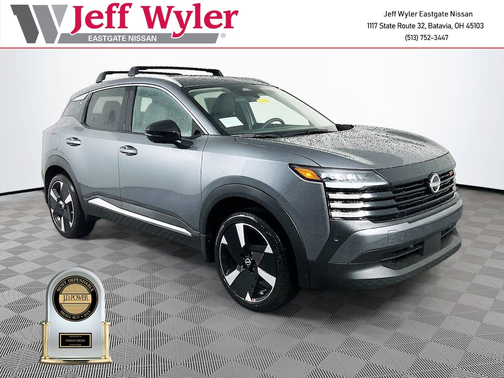 Gun Metallic 2026 Nissan Kicks SR 2.0L DOHC AWD CVT with Xtronic 27/34 City/Highway MPG Jeff Wyler Eastgate Auto Mall is very proud to offer this handsome 2026 Nissan Kicks SR in Gun Metallic. Well equipped with: Cold Weather Package (Heated Front Seats, Heated Mirrors, and Rear Floor Heater Ducts), 17" Alloy Wheels, 19" Alloy Wheels, 4-Wheel Disc Brakes, 6 Speakers, ABS brakes, Air Conditioning, Alloy wheels, AM/FM radio, Auto High-beam Headlights, Automatic temperature control, Brake assist, Bumpers: body-color, Carpeted Floor Mats, Crossbars, Delay-off headlights, Driver door bin, Driver vanity mirror, Dual front impact airbags, Dual front side impact airbags, Electronic Stability Control, Emergency communication system: NissanConnect Services, Exterior Parking Camera Rear, Four wheel independent suspension, Front anti-roll bar, Front Bucket Seats, Front Center Armrest, Front reading lights, Fully automatic headlights, Garage door transmitter: myQ Connected Garage, Illuminated entry, Knee airbag, Leather Shift Knob, Leather steering wheel, Low tire pressure warning, NissanConnect featuring Apple CarPlay and Android Auto, Occupant sensing airbag, Outside temperature display, Overhead airbag, Overhead console, Panic alarm, Passenger door bin, Passenger vanity mirror, Power door mirrors, Power steering, Power windows, Radio data system, Radio: AM/FM/SiriusXM Audio System, Rear anti-roll bar, Rear reading lights, Rear seat center armrest, Rear side impact airbag, Rear window defroster, Rear window wiper, Remote keyless entry, Security system, Speed control, Speed-sensing steering, Splash Guards, Split folding rear seat, Spoiler, Sport Leatherette w/Cloth Insert Seat Trim, Sport steering wheel, Steering wheel mounted audio controls, Tachometer, Telescoping steering wheel, Tilt steering wheel, Traction control, Trip computer, Turn signal indicator mirrors, and Variably intermittent wipers. 27/34 City/Highway MPG Price includes: $1000 - Nissan Customer Cash. Exp. 01/05/2026 $500 - Nissan MWR MY26 Kicks Bonus Cash - December. Exp. 01/05/2026