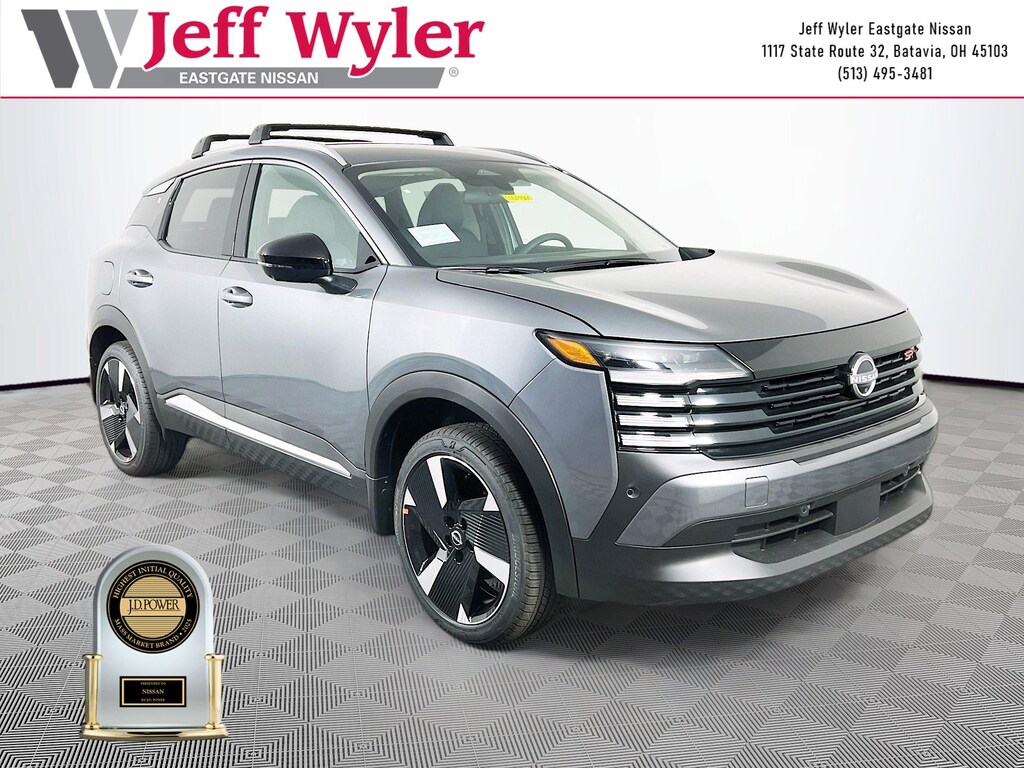 Gun Metallic 2026 Nissan Kicks SR 2.0L DOHC AWD CVT with Xtronic 27/34 City/Highway MPG Jeff Wyler Eastgate Auto Mall is pleased to offer this fantastic-looking 2026 Nissan Kicks SR in Gun Metallic. Well equipped with: Cold Weather Package (Heated Front Seats, Heated Mirrors, and Rear Floor Heater Ducts), 17" Alloy Wheels, 19" Alloy Wheels, 4-Wheel Disc Brakes, 6 Speakers, ABS brakes, Air Conditioning, Alloy wheels, AM/FM radio, Auto High-beam Headlights, Automatic temperature control, Brake assist, Bumpers: body-color, Carpeted Floor Mats, Crossbars, Delay-off headlights, Driver door bin, Driver vanity mirror, Dual front impact airbags, Dual front side impact airbags, Electronic Stability Control, Emergency communication system: NissanConnect Services, Exterior Parking Camera Rear, Four wheel independent suspension, Front anti-roll bar, Front Bucket Seats, Front Center Armrest, Front reading lights, Fully automatic headlights, Garage door transmitter: myQ Connected Garage, Illuminated entry, Knee airbag, Leather Shift Knob, Leather steering wheel, Low tire pressure warning, NissanConnect featuring Apple CarPlay and Android Auto, Occupant sensing airbag, Outside temperature display, Overhead airbag, Overhead console, Panic alarm, Passenger door bin, Passenger vanity mirror, Power door mirrors, Power steering, Power windows, Radio data system, Radio: AM/FM/SiriusXM Audio System, Rear anti-roll bar, Rear reading lights, Rear seat center armrest, Rear side impact airbag, Rear window defroster, Rear window wiper, Remote keyless entry, Security system, Speed control, Speed-sensing steering, Splash Guards, Split folding rear seat, Spoiler, Sport Leatherette with Cloth Insert Seat Trim, Sport steering wheel, Steering wheel mounted audio controls, Tachometer, Telescoping steering wheel, Tilt steering wheel, Traction control, Trip computer, Turn signal indicator mirrors, and Variably intermittent wipers. 27/34 City/Highway MPG Price includes: $1500 - Nissan Customer Cash. Exp. 05/04/2026
