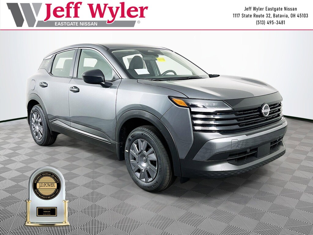 Gun Metallic 2026 Nissan Kicks S 2.0L DOHC AWD CVT with Xtronic 27/34 City/Highway MPG Jeff Wyler Eastgate Auto Mall is pumped up to offer this terrific-looking 2026 Nissan Kicks S in Gun Metallic. Well equipped with: 4 Speakers, 4-Wheel Disc Brakes, ABS brakes, Air Conditioning, AM/FM radio, Auto High-beam Headlights, Blind Spot Warning, Brake assist, Bumpers: body-color, Carpeted Floor Mats, Cloth Seat Trim, Driver door bin, Driver vanity mirror, Driver's Seat Mounted Armrest, Dual front impact airbags, Dual front side impact airbags, Electronic Stability Control, Emergency communication system, Exterior Parking Camera Rear, Four wheel independent suspension, Front anti-roll bar, Front Bucket Seats, Front reading lights, Fully automatic headlights, Illuminated entry, Knee airbag, Low tire pressure warning, NissanConnect featuring Apple CarPlay and Android Auto, Occupant sensing airbag, Outside temperature display, Overhead airbag, Panic alarm, Passenger door bin, Passenger vanity mirror, Power door mirrors, Power steering, Power windows, Radio data system, Radio: AM/FM/SiriusXM Audio System, Rear anti-roll bar, Rear reading lights, Rear side impact airbag, Rear window defroster, Rear window wiper, Remote keyless entry, Security system, Speed control, Speed-sensing steering, Splash Guards, Split folding rear seat, Spoiler, Sport steering wheel, Steering wheel mounted audio controls, Tachometer, Telescoping steering wheel, Tilt steering wheel, Traction control, Trip computer, Variably intermittent wipers, and Wheels: 16" Steel with Full Covers. 27/34 City/Highway MPG