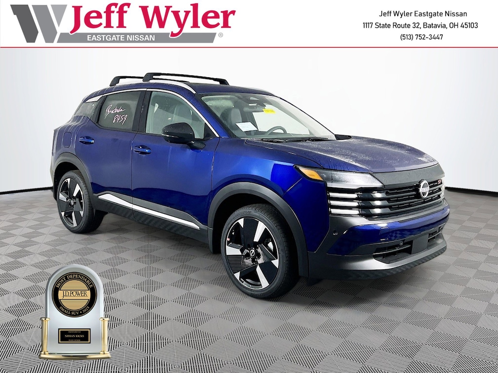 Deep Blue Pearl 2026 Nissan Kicks SR 2.0L DOHC FWD CVT with Xtronic 28/35 City/Highway MPG Jeff Wyler Eastgate Auto Mall is honored to offer this gorgeous-looking 2026 Nissan Kicks SR in Deep Blue Pearl. Well equipped with: Cold Weather Package (Heated Front Seats, Heated Mirrors, and Rear Floor Heater Ducts), SR Premium Package (Bose 10 -Speaker Audio, Driver Seat-Mounted Supplemental Air Bag, Heated Steering Wheel, and Panoramic Moonroof), 17" Alloy Wheels, 19" Alloy Wheels, 4-Wheel Disc Brakes, 6 Speakers, ABS brakes, Air Conditioning, Alloy wheels, AM/FM radio, Auto High-beam Headlights, Automatic temperature control, Brake assist, Bumpers: body-color, Carpeted Floor Mats & Underfloor Protector, Crossbars, Delay-off headlights, Driver door bin, Driver vanity mirror, Dual front impact airbags, Dual front side impact airbags, Electronic Stability Control, Emergency communication system: NissanConnect Services, Exterior Parking Camera Rear, Front anti-roll bar, Front Bucket Seats, Front Center Armrest, Front reading lights, Front wheel independent suspension, Fully automatic headlights, Garage door transmitter: myQ Connected Garage, Illuminated entry, Knee airbag, Leather Shift Knob, Leather steering wheel, Low tire pressure warning, NissanConnect featuring Apple CarPlay and Android Auto, Occupant sensing airbag, Outside temperature display, Overhead airbag, Overhead console, Panic alarm, Passenger door bin, Passenger vanity mirror, Power door mirrors, Power steering, Power windows, Radio data system, Radio: AM/FM/SiriusXM Audio System, Rear anti-roll bar, Rear reading lights, Rear seat center armrest, Rear side impact airbag, Rear window defroster, Rear window wiper, Remote keyless entry, Security system, Speed control, Speed-sensing steering, Splash Guards, Split folding rear seat, Spoiler, Sport Leatherette w/Cloth Insert Seat Trim, Sport steering wheel, Steering wheel mounted audio controls, Tachometer, Telescoping steering wheel, Tilt steering wheel, Traction control, Trip computer, Turn signal indicator mirrors, and Variably intermittent wipers. 28/35 City/Highway MPG Price includes: $1000 - Nissan Customer Cash. Exp. 01/05/2026 $500 - Nissan MWR MY26 Kicks Bonus Cash - December. Exp. 01/05/2026