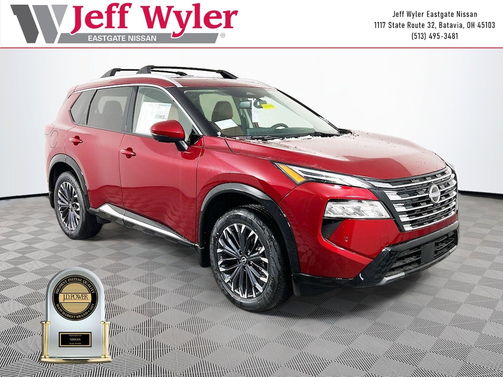 Priced below KBB Fair Purchase Price! Scarlet Ember Tintcoat 2026 Nissan Rogue Platinum 1.5L DOHC AWD CVT with Xtronic 28/35 City/Highway MPG Jeff Wyler Eastgate Auto Mall is delighted to offer this terrific 2026 Nissan Rogue Platinum in Scarlet Ember Tintcoat. Well equipped with: Platinum Premium Package (Head-Up Display, Heated Rear Seats, Motion-Activated Power Liftgate, and Tri-Zone Automatic Temperature Control), 10 Speakers, 4-Wheel Disc Brakes, ABS brakes, Air Conditioning, Alloy wheels, AM/FM radio: SiriusXM w/360L, Auto High-beam Headlights, Auto-dimming Rear-View mirror, Automatic temperature control, Black Splash Guards (set of 4), Bose Premium Audio System, Brake assist, Bumpers: body-color, Chrome Rear Bumper Protector, Delay-off headlights, Driver door bin, Driver vanity mirror, Dual front impact airbags, Dual front side impact airbags, Electronic Stability Control, Emergency communication system: NissanConnect Services, First Aid Kit, Floor Mats with 2-Piece Cargo Area Protector, Four wheel independent suspension, Front anti-roll bar, Front Bucket Seats, Front Center Armrest, Front dual zone A/C, Front reading lights, Fully automatic headlights, Garage door transmitter: myQ Connected Garage, Heads-Up Display, Heated door mirrors, Heated Front Bucket Seats, Heated front seats, Heated steering wheel, Illuminated entry, Knee airbag, Low tire pressure warning, Memory seat, Navigation system: Google Maps, Occupant sensing airbag, Outside temperature display, Overhead airbag, Overhead console, Panic alarm, Passenger door bin, Passenger vanity mirror, Power door mirrors, Power driver seat, Power Liftgate, Power moonroof, Power passenger seat, Power steering, Power windows, Premium Paint, Quilted Semi-Aniline Leather-Appointed Seat Trim, Radio data system, Radio: AM/FM NissanConnect with Navigation, Rear anti-roll bar, Rear reading lights, Rear seat center armrest, Rear side impact airbag, Rear window defroster, Rear window wiper, Remote keyless entry, Retractable Cargo Cover, Roof Rail Cross Bars, Security system, Speed control, Speed-sensing steering, Speed-Sensitive Wipers, Split folding rear seat, Spoiler, Steering wheel mounted audio controls, Tachometer, Telescoping steering wheel, Tilt steering wheel, Traction control, Trip computer, Turn signal indicator mirrors, Variably intermittent wipers, Wheels: 19" Unique Dark Painted Aluminum Alloy, and Wireless Apple CarPlay/Wireless Android Auto. 28/35 City/Highway MPG Price includes: $3500 - Nissan Customer Cash. Exp. 03/31/2026