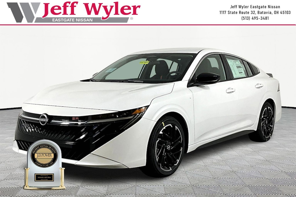 Aspen White Tricoat 2026 Nissan Sentra SR 2.0L I4 DOHC FWD CVT with Xtronic 30/38 City/Highway MPG Jeff Wyler Eastgate Auto Mall is delighted to offer this beautiful 2026 Nissan Sentra SR in Aspen White Tricoat. Well equipped with: Floor Mat Package, 18" Black Alloy Wheels, 18" Machined Alloy Wheels, 4-Wheel Disc Brakes, 6 Speakers, ABS brakes, Air Conditioning, Alloy wheels, AM/FM radio: Sirius, Auto High-beam Headlights, Automatic temperature control, Brake assist, Bumpers: body-color, Delay-off headlights, Driver door bin, Driver vanity mirror, Dual front impact airbags, Dual front side impact airbags, Electronic Stability Control, Emergency communication system: NissanConnect Services, Four wheel independent suspension, Front anti-roll bar, Front Bucket Seats, Front Center Armrest, Front reading lights, Fully automatic headlights, Garage door transmitter, Heated door mirrors, Illuminated entry, Illuminated Kick Plates, Knee airbag, Leather steering wheel, Low tire pressure warning, Nissan USB Charging Cable Set, Occupant sensing airbag, Outside temperature display, Overhead airbag, Overhead console, Panic alarm, Passenger door bin, Passenger vanity mirror, Power door mirrors, Power steering, Power windows, Premium Paint, Radio data system, Radio: AM/FM with RDS/MP3, Rear anti-roll bar, Rear seat center armrest, Rear side impact airbag, Rear window defroster, Remote keyless entry, Security system, Speed control, Speed-sensing steering, Split folding rear seat, Spoiler, Sport Cloth Seat Trim, Steering wheel mounted audio controls, Tachometer, Telescoping steering wheel, Tilt steering wheel, Traction control, Trip computer, Turn signal indicator mirrors, Variably intermittent wipers, and Wireless Apple CarPlay/Wireless Android Auto. 30/38 City/Highway MPG Price includes: $500 - Nissan Customer Cash. Exp. 05/04/2026