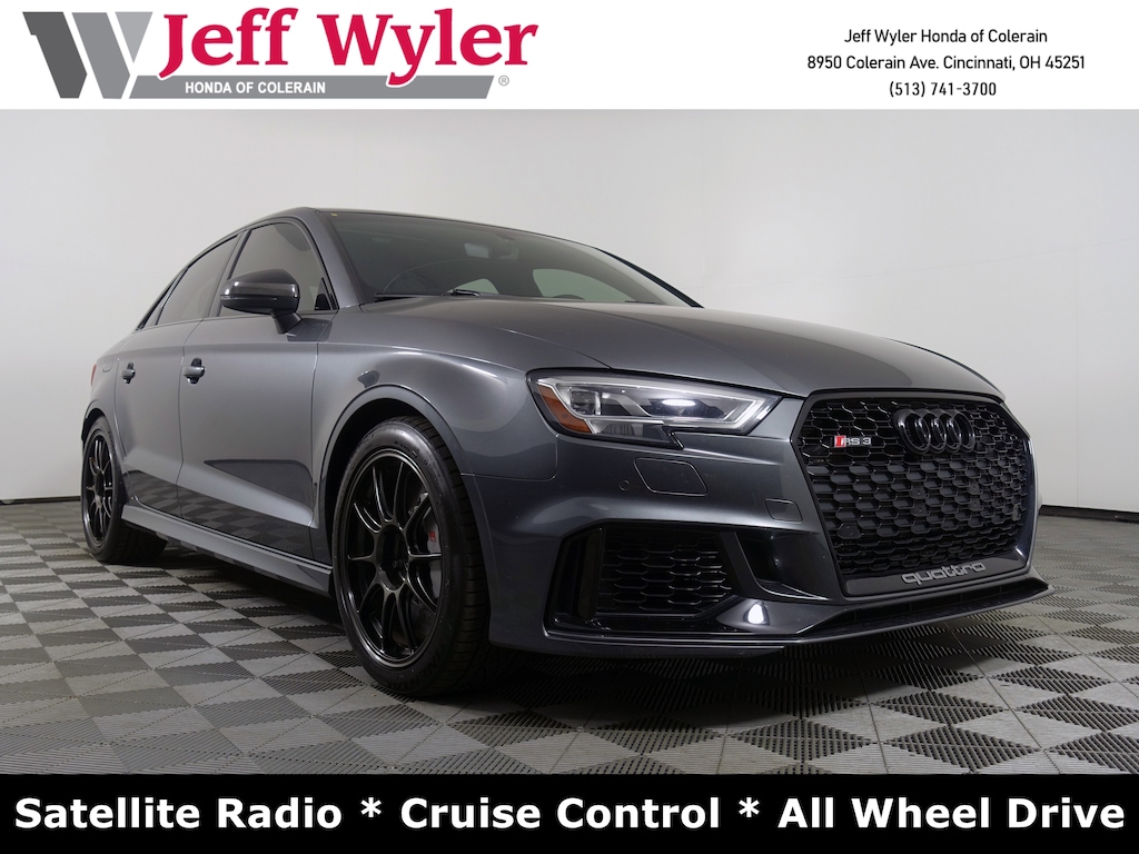 Jeff Wyler Honda of Colerain is delighted to offer this good-looking 2018 Audi RS 3 2.5T in Gray. Well equipped with: 10 Speakers, 4-Wheel Disc Brakes, ABS brakes, Adaptive suspension, Air Conditioning, Alloy wheels, AM/FM radio: SiriusXM, Auto-dimming door mirrors, Auto-dimming Rear-View mirror, Automatic temperature control, Brake assist, Bumpers: body-color, CD player, Compass, Delay-off headlights, Driver door bin, Driver vanity mirror, Dual front impact airbags, Dual front side impact airbags, Electronic Stability Control, Exterior Parking Camera Rear, Fine Nappa Leather Seat Trim, Four wheel independent suspension, Front anti-roll bar, Front Bucket Seats, Front Center Armrest, Front dual zone A/C, Front fog lights, Front reading lights, Headlight cleaning, Heated door mirrors, Heated front seats, Heated S Sport Front Seats, Illuminated entry, Knee airbag, Low tire pressure warning, Occupant sensing airbag, Outside temperature display, Overhead airbag, Panic alarm, Passenger door bin, Passenger vanity mirror, Power door mirrors, Power moonroof, Power steering, Power windows, Radio data system, Radio: Audi Sound System, Rain sensing wipers, Rear anti-roll bar, Rear fog lights, Rear reading lights, Rear seat center armrest, Rear window defroster, Remote keyless entry, Security system, Speed control, Speed-sensing steering, Speed-Sensitive Wipers, Split folding rear seat, Spoiler, Sport steering wheel, Steering wheel mounted audio controls, Tachometer, Telescoping steering wheel, Tilt steering wheel, Traction control, Trip computer, Turn signal indicator mirrors, Variably intermittent wipers, and Wheels: 19" 5-Arm-Blade-Design Silver Finish.