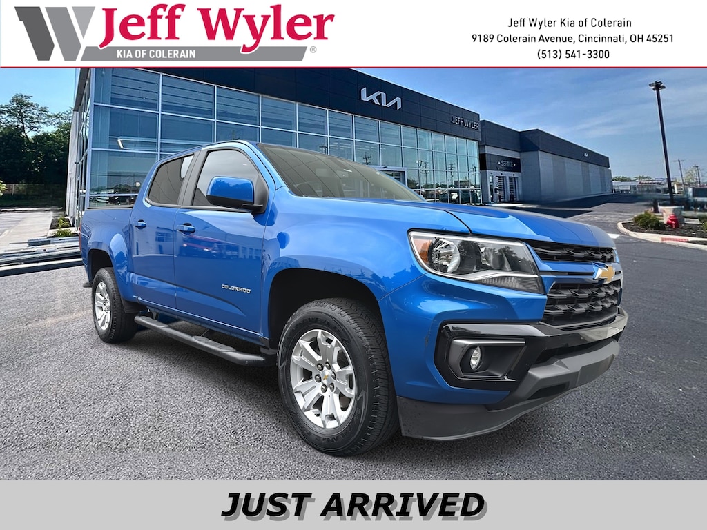 Jeff Wyler Kia of Colerain is excited to offer this beautiful-looking 2022 Chevrolet Colorado LT in Bright Blue Metallic. LT Convenience Package (Front Fog Lamps, Manual Rear-Sliding Window, Rear-Window Electric Defogger, and Remote Vehicle Starter System), Preferred Equipment Group 2LT (Enhanced Driver Instrument Information Display and Rear Vision Camera), 4-Wheel Disc Brakes, 4.10 Rear Axle Ratio, 6 Speakers, 6-Speaker Audio System Feature, ABS brakes, Air Conditioning, Alloy wheels, AM/FM radio: SiriusXM, Apple CarPlay/Android Auto, Auto-dimming Rear-View mirror, Automatic Locking Rear Differential, Bumpers: body-color, Cloth Seat Trim, Compass, Delay-off headlights, Driver 6-Way Power Seat Adjuster, Driver door bin, Driver vanity mirror, Dual front impact airbags, Dual front side impact airbags, Electronic Stability Control, Exterior Parking Camera Rear, Front anti-roll bar, Front Bucket Seats, Front Center Armrest, Front reading lights, Front wheel independent suspension, Fully automatic headlights, Illuminated entry, Low tire pressure warning, Occupant sensing airbag, Outside Heated Power-Adjustable Body-Color Mirrors, Outside temperature display, Overhead airbag, Overhead console, Panic alarm, Passenger door bin, Passenger vanity mirror, Power door mirrors, Power driver seat, Power steering, Power windows, Premium audio system: Chevrolet Infotainment 3, Radio data system, Radio: Chevrolet Infotainment 3 System, Rear reading lights, Rear seat center armrest, Rear step bumper, Remote keyless entry, Security system, SiriusXM Radio, Speed control, Speed-sensing steering, Steering wheel mounted audio controls, Tachometer, Telescoping steering wheel, Tilt steering wheel, Traction control, Trip computer, Variably intermittent wipers, and Wheels: 17" x 8" Blade Silver Metallic Cast Alloy Our PRE-OWNED vehicles are put through a rigorous 167- POINT QUALITY ASSURANCE INSPECTION along with an average amount of over $1,400.00 SPENT to recondition each vehicle so we can be sure to deliver you the highest quality vehicle like you deserve! ***ONLINE PRICE DOES NOT INCLUDE WYLER FAMILY FIRST PACKAGE***