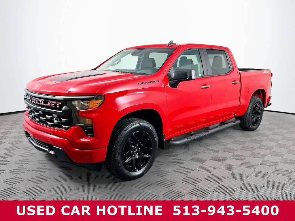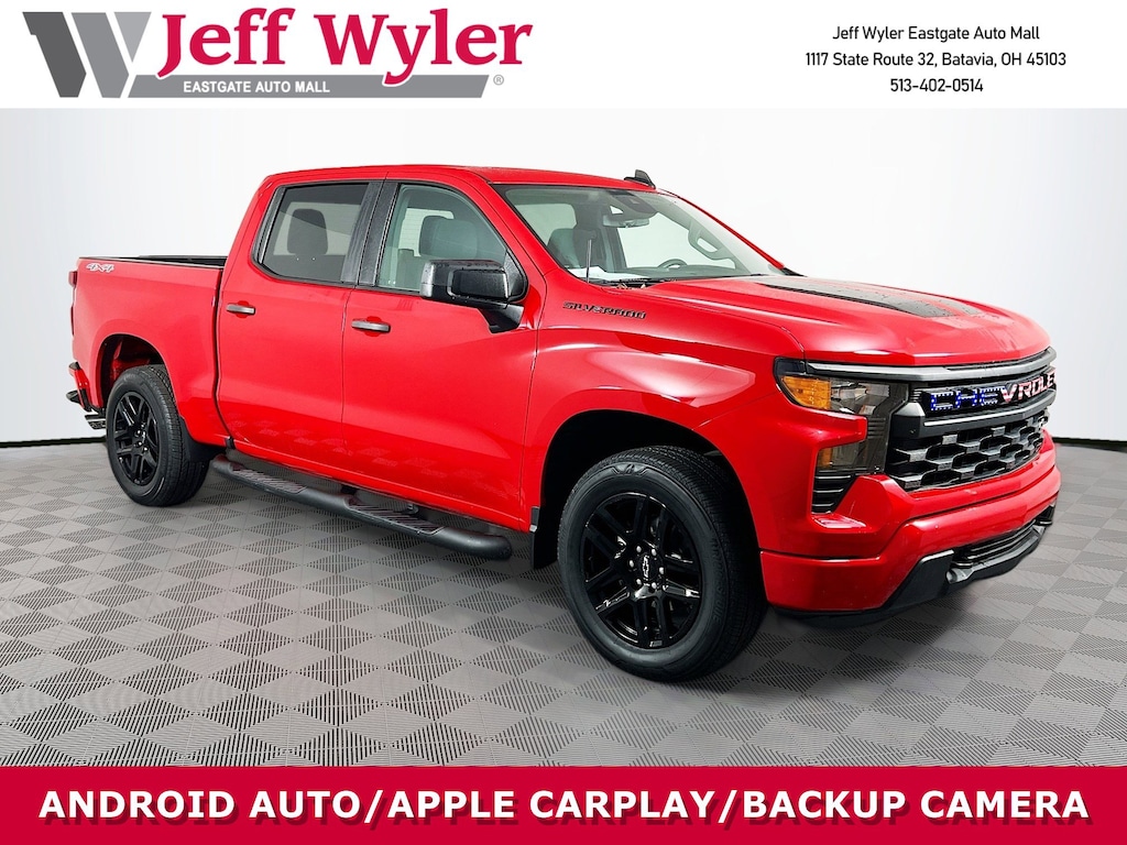 Jeff Wyler Eastgate Auto Mall is pumped up to offer this fantastic-looking 2023 Chevrolet Silverado 1500 Custom in Red Hot. Well equipped with: Custom Convenience Package (Electric Rear-Window Defogger, EZ Lift Power Lock & Release Tailgate, LED Cargo Area Lighting, Remote Vehicle Starter System, and Theft Deterrent System (Unauthorized Entry)), Custom Value Package, High Capacity Suspension Package, Preferred Equipment Group 1CX (10-Way Power Driver Seat w/Lumbar, 120-Volt Bed Mounted Power Outlet, 120-Volt Instrument Panel Power Outlet, 3.5" Monochromatic Display Driver Info Center, Bluetooth® For Phone, Chevrolet Connected Access Capable, Color-Keyed Carpeting Floor Covering, Compass, Deep-Tinted Glass, Dual Rear USB Ports (Charge Only), Electrical Steering Column Lock, Electronic Cruise Control, Front Frame-Mounted Black Recovery Hooks, Front Rubberized Vinyl Floor Mats, HD Rear Vision Camera, Manual Tilt Wheel Steering Column, OnStar & Chevrolet Connected Services Capable, Power Front Windows w/Driver Express Up/Down, Power Front Windows w/Passenger Express Down, Power Rear Windows w/Express Down, Rear 60/40 Folding Bench Seat (Folds Up), Rear Rubberized-Vinyl Floor Mats, Remote Keyless Entry, SiriusXM Radio, Standard Tailgate, Wi-Fi Hot Spot Capable, and Wireless Phone Projection), Rally Edition (4" Black Round Assist Steps (LPO), Black Chrome Exhaust Tip (LPO), Chevytec Spray-On Black Bedliner, and Wheels: 20" x 9" High Gloss Black Painted Alum), Trailering Package (Hitch Guidance), 3.42 Rear Axle Ratio, 4-Wheel Disc Brakes, 40/20/40 Front Split-Bench Seat, 6 Speakers, 6-Speaker Audio System, ABS brakes, Air Conditioning, Alloy wheels, AM/FM radio: SiriusXM, Apple CarPlay/Android Auto, Auto High-beam Headlights, Auto-Locking Rear Differential, Automatic Emergency Braking, Brake assist, Bumpers: body-color, Cloth Seat Trim, Delay-off headlights, Driver door bin, Driver vanity mirror, Dual front impact airbags, Dual front side impact airbags, Electronic Stability Control, Following Distance Indicator, Forward Collision Alert, Front anti-roll bar, Front Center Armrest w/Storage, Front License Plate Kit, Front Pedestrian Braking, Front reading lights, Front wheel independent suspension, Fully automatic headlights, Heated door mirrors, Illuminated entry, IntelliBeam Automatic High Beam On/Off, Lane Keep Assist w/Lane Departure Warning, Low tire pressure warning, Manual Tilt/Telescoping Steering Column (DISC), Not Equipped w/Rear USB Ports, Not Equipped w/Steering Column Lock, Occupant sensing airbag, Outside temperature display, Overhead airbag, Overhead console, Panic alarm, Passenger door bin, Passenger vanity mirror, Power door mirrors, Power driver seat, Power steering, Power windows, Premium audio system: Chevrolet Infotainment 3, Radio data system, Radio: Chevrolet Infotainment 3 System, Rear reading lights, Rear step bumper, Rear window defroster, Remote keyless entry, Security system, Speed control, Speed-sensing steering, Split folding rear seat, Tachometer, Tilt steering wheel, Traction control, Trip computer, Variably intermittent wipers, Voltmeter, and Wheels: 20" x 9" Bright Silver Painted Aluminum. CARFAX One-Owner. Clean CARFAX. Ask about available certifications. Used vehicles 10 years of age or newer with less than 100,000 miles are eligible for the Wyler Assurance Program, but eligible vehicles must pass our reconditioning process and multi-point inspection. Provided the vehicle passes inspection, vehicles will be eligible for the 6 month/6,000 mile limited warranty. The 6 month/6,000 mile limited warranty is NOT available on AS-IS vehicles, wholesale vehicles, lease buyback/pass-thru vehicles or un-inspected vehicles. Note that this program can also apply to vehicles where the remaining factory coverage is less than 6 months or 6,000 miles. Please check the Federal Trade Commission (FTC) Buyers guide on the vehicle for full details as to whether or not warranty coverage may apply. Contact Dealer for addit