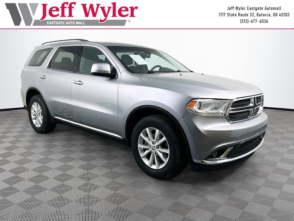 Jeff Wyler Eastgate Auto Mall is proud to offer this superb-looking 2015 Dodge Durango SXT in Billet Silver Metallic Clearcoat. Well equipped with: Comfort Seating Group, Popular Equipment Group (Bluetooth® Streaming Audio, Heated Front Seats, Heated Steering Wheel, ParkSense Rear Park Assist System, ParkView Rear Back-Up Camera, and Rear-View Auto-Dimming Mirror w/Microphone), Quick Order Package 23B (1-Yr SIRIUSXM Radio Service, Bright Side Roof Rails, For More Info Call 800-643-2112, Integrated Roof Rail Crossbars, Leather Wrapped Steering Wheel, Power 4-Way Driver Lumbar Adjust, Power 8-Way Driver/Manual Passenger Seat, and SIRIUSXM Satellite Radio), 3.45 Rear Axle Ratio, 3rd row seats: split-bench, 4-Wheel Disc Brakes, 6 Mo. Trial (Registration Required), 6 Speakers, 8.4" Touchscreen Display, ABS brakes, Air Conditioning, Alloy wheels, AM/FM radio, Anti-whiplash front head restraints, Automatic temperature control, Brake assist, Bumpers: body-color, Cloth Low-Back Bucket Seats, Compass, Delay-off headlights, Driver door bin, Driver vanity mirror, Dual front impact airbags, Dual front side impact airbags, Electronic Stability Control, For Details Visit DriveUconnect.com, Four wheel independent suspension, Front anti-roll bar, Front Bucket Seats, Front Center Armrest w/Storage, Front dual zone A/C, Front fog lights, Front reading lights, Fully automatic headlights, GPS Antenna Input, Heated door mirrors, Illuminated entry, Integrated Voice Command w/Bluetooth, Knee airbag, Low tire pressure warning, Nav-Capable! See Dealer for Details, Occupant sensing airbag, Outside temperature display, Overhead airbag, Overhead console, Panic alarm, Passenger door bin, Passenger vanity mirror, Power door mirrors, Power steering, Power windows, Radio: Uconnect 5.0, Radio: Uconnect 8.4, Rear air conditioning, Rear anti-roll bar, Rear reading lights, Rear seat center armrest, Rear window defroster, Rear window wiper, Remote keyless entry, Roadside Assistance & 9-1-1 Call, Speed control, Speed-Sensitive Wipers, Split folding rear seat, Spoiler, Steering wheel mounted audio controls, Tachometer, Telescoping steering wheel, Tilt steering wheel, Traction control, Trip computer, Uconnect Access, Uconnect Voice Command w/Bluetooth, Variably intermittent wipers, and Wheels: 18" x 8.0" Painted AluminuM. Reviews: * If youâre shopping for a 7-passenger sport-utility vehicle that doesnât look and feel like a glorified pickup truck, check out the 2015 Dodge Durango SUV. In R/T and Limited trim, it can be quite cool and the Hemi V8 gives the Durango real attitude. Source: KBB.com * Easy to maneuver; well-trimmed, high-tech cabin; powerful optional V8; generous towing capacity; available 4WD with low-range gearing. Source: EdmundsAsk about available certifications. Used vehicles 10 years of age or newer with less than 100,000 miles are eligible for the Wyler Assurance Program, but eligible vehicles must pass our reconditioning process and multi-point inspection. Provided the vehicle passes inspection, vehicles will be eligible for the 6 month/6,000 mile limited warranty. The 6 month/6,000 mile limited warranty is NOT available on AS-IS vehicles, wholesale vehicles, lease buyback/pass-thru vehicles or un-inspected vehicles. Note that this program can also apply to vehicles where the remaining factory coverage is less than 6 months or 6,000 miles. Please check the Federal Trade Commission (FTC) Buyers guide on the vehicle for full details as to whether or not warranty coverage may apply. Contact Dealer for additional details. The Wyler Assurance 6 month/6,000 Mile limited warranty ends 6 months from the date of the Retail Purchase Agreement (BUYERS ORDER) or when the vehicle's odometer registers 6,000 additional miles to the mileage listed on the BUYERS ORDER, whichever comes first. Your Deductible - The warranty holder on your contract pays the first $100 of each covered repair.