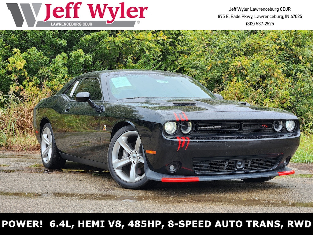 Jeff Wyler Chrysler Dodge Jeep of Lawrenceburg is excited to offer this handsome 2016 Dodge Challenger R/T Scat Pack in Pitch Black Clearcoat. Driver Convenience Group, Leather Interior Group, Quick Order Package 24G R/T Scat Pack (3.09 Rear Axle Ratio), Scat Pack Appearance Group (Int/Ext), Technology Group (Auto High Beam Headlamp Control and Rain Sensitive Windshield Wipers), 20" x 9.0" Aluminum Wheels, 230MM Rear Axle, 4-Wheel Disc Brakes, 5-Year SiriusXM Traffic Service, 5-Year SiriusXM Travel Link Service, 6 Speakers, 8.4" Touchscreen Display, ABS brakes, Air Conditioning, Alloy wheels, AM/FM radio: SiriusXM, Anti-whiplash front head restraints, Auto-dimming Rear-View mirror, Automatic temperature control, Brake assist, Bumpers: body-color, Cloth Performance Seats, Compass, Delay-off headlights, Driver door bin, Driver vanity mirror, Dual front impact airbags, Dual front side impact airbags, Electronic Stability Control, Emergency communication system: Uconnect Access, Four wheel independent suspension, Front anti-roll bar, Front Bucket Seats, Front Center Armrest, Front dual zone A/C, Front fog lights, Front reading lights, Fully automatic headlights, GPS Navigation, HD Radio, Heated door mirrors, Illuminated entry, Integrated Voice Command w/Bluetooth, Leather Shift Knob, Low tire pressure warning, Media Hub (SD, USB, AUX Ports), Outside temperature display, Overhead airbag, Overhead console, Panic alarm, ParkView Rear Back-Up Camera, Passenger door bin, Passenger vanity mirror, Power door mirrors, Power driver seat, Power steering, Power Sunroof, Power windows, Radio data system, Radio: Uconnect 8.4, Radio: Uconnect 8.4 NAV, Rear anti-roll bar, Rear reading lights, Rear seat center armrest, Rear window defroster, Remote keyless entry, Security system, SiriusXM Satellite Radio, SiriusXM Traffic, SiriusXM Travel Link, Speed control, Speed-sensing steering, Split folding rear seat, Spoiler, Steering wheel mounted audio controls, Tachometer, Telescoping steering wheel, Tilt steering wheel, Traction control, Trip computer, Uconnect Access, Variably intermittent wipers, and Wheels: 20" x 9.0" Forged/Painted Aluminum Our PRE-OWNED vehicles are put through a rigorous 167- POINT QUALITY ASSURANCE INSPECTION along with an average amount of over $1,400.00 SPENT to recondition each vehicle so we can be sure to deliver you the highest quality vehicle like you deserve! ***ONLINE PRICE DOES NOT INCLUDE WYLER FAMILY FIRST PACKAGE*** Stop by 4136 Shelbyville Road to see for yourself, or give us a call @ 502-897-3151 to schedule your test drive! Ask about available certifications.