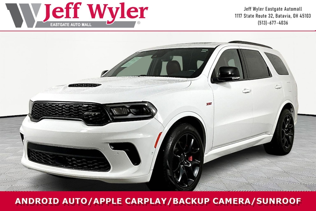 Jeff Wyler Eastgate Auto Mall is honored to offer this wonderful 2024 Dodge Durango SRT 392 in White Knuckle Clearcoat. Well equipped with: Quick Order Package 29N SRT 392 Premium (1 USB Charging Port in Console, 12V Auxiliary Power Outlet In Console, 19 harman/kardon Amplified Speakers w/Subwoofer, 2 Pc Brembo Front Rotor Brakes, 2nd Row Console w/Armrest & Storage, 3rd Row Floor Mat & Full Console, 7 & 4 Pin Wiring Harness, 825 Watt Amplifier, Adaptive Cruise Control w/Stop, Advanced Brake Assist, Black Roof Rails, Blind Spot w/Trailer Detection, Class IV Receiver Hitch, Forged Carbon Fiber Interior Accents, Full Speed Forward Collision Warning Plus, High Performance Laguna Leather Seats, Illuminated Rear Cupholders, Integrated Roof Rail Crossbars, Lane Departure Warning Plus, Power Sunroof, Premium Instrument Panel, Red Seat Belts, Suede Headliner, and Trailer Brake Control), 2nd Row Mini Console w/Cupholders, 3.70 Rear Axle Ratio, 3rd Row Floor Mat & Mini Console, 3rd row seats: split-bench, 4-Wheel Disc Brakes, 9 Speakers, ABS brakes, Adaptive suspension, Air Conditioning, Alloy wheels, AM/FM radio: SiriusXM w/360L, Apple CarPlay/Android Auto, Audio memory, Auto High-beam Headlights, Auto-dimming door mirrors, Auto-dimming Rear-View mirror, Automatic temperature control, Brake assist, Bumpers: body-color, Compass, Delay-off headlights, Driver door bin, Driver vanity mirror, Dual front impact airbags, Dual front side impact airbags, Electronic Stability Control, Emergency communication system, Four wheel independent suspension, Front anti-roll bar, Front Bucket Seats, Front Center Armrest w/Storage, Front dual zone A/C, Front reading lights, Fully automatic headlights, Garage door transmitter, Gloss Black Exterior Mirrors, Heated door mirrors, Heated front seats, Heated rear seats, Heated steering wheel, Illuminated entry, Knee airbag, Leather Shift Knob, Leather steering wheel, Leather Trimmed Bucket Seats, Low tire pressure warning, Memory seat, Navigation system: TomTom, Occupant sensing airbag, Outside temperature display, Overhead airbag, Overhead console, Panic alarm, ParkView Rear Back-Up Camera, Passenger door bin, Passenger vanity mirror, Power door mirrors, Power driver seat, Power Liftgate, Power passenger seat, Power steering, Power windows, Radio data system, Radio: Uconnect 5 Nav w/10.1" Display, Rain sensing wipers, Rear air conditioning, Rear anti-roll bar, Rear reading lights, Rear window defroster, Rear window wiper, Remote keyless entry, Security system, Speed control, Speed-sensing steering, Speed-Sensitive Wipers, Split folding rear seat, Spoiler, Sport steering wheel, Steering wheel mounted audio controls, Tachometer, Telescoping steering wheel, Tilt steering wheel, Traction control, Trip computer, Turn signal indicator mirrors, Variably intermittent wipers, Ventilated front seats, Voltmeter, and Wheels: 20" x 10" Hyper Black Aluminum. CARFAX One-Owner. Clean CARFAX. Ask about available certifications. Used vehicles 10 years of age or newer with less than 100,000 miles are eligible for the Wyler Assurance Program, but eligible vehicles must pass our reconditioning process and multi-point inspection. Provided the vehicle passes inspection, vehicles will be eligible for the 6 month/6,000 mile limited warranty. The 6 month/6,000 mile limited warranty is NOT available on AS-IS vehicles, wholesale vehicles, lease buyback/pass-thru vehicles or un-inspected vehicles. Note that this program can also apply to vehicles where the remaining factory coverage is less than 6 months or 6,000 miles. Please check the Federal Trade Commission (FTC) Buyers guide on the vehicle for full details as to whether or not warranty coverage may apply. Contact Dealer for additional details. The Wyler Assurance 6 month/6,000 Mile limited warranty ends 6 months from the date of the Retail Purchase Agreement (BUYERS ORDER) or when the vehicle's odometer registers 6,000 additional miles to the mileage listed on the BUYERS ORDER, which