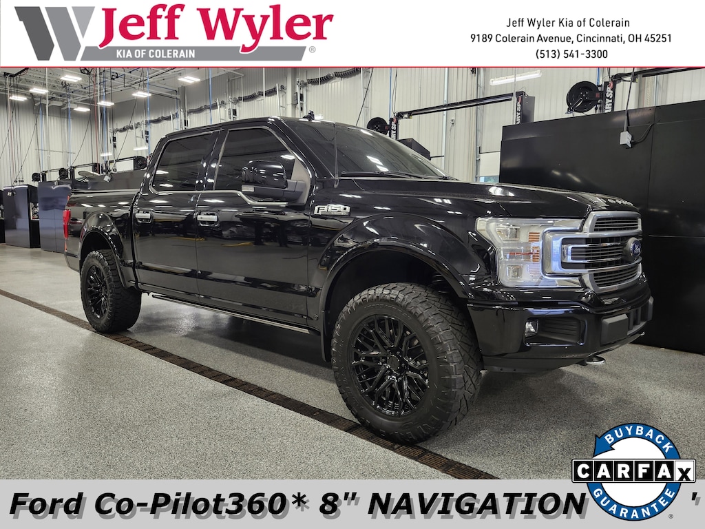 Jeff Wyler Kia of Colerain is proud to offer this good-looking 2019 Ford F-150 Limited in Agate Black Metallic. Equipment Group 900A Base, GVWR: 6,750 lbs Payload Package, Trailer Tow Package (Class IV Trailer Hitch Receiver, Engine Oil Cooler, Pro Trailer Backup Assist, and Upgraded Front Stabilizer Bar), 10 Speakers, 22" Polished Aluminum Wheels, 4-Wheel Disc Brakes, ABS brakes, Adjustable pedals, Air Conditioning, Alloy wheels, AM/FM radio: SiriusXM, AppLink/Apple CarPlay and Android Auto, Auto High-beam Headlights, Auto tilt-away steering wheel, Auto-dimming door mirrors, Auto-dimming Rear-View mirror, Automatic temperature control, Brake assist, Bumpers: body-color, Compass, Delay-off headlights, Driver door bin, Driver vanity mirror, Dual front impact airbags, Dual front side impact airbags, Electronic Locking w/3.55 Axle Ratio, Electronic Stability Control, Emergency communication system: SYNC 3 911 Assist, Exterior Parking Camera Rear, Front anti-roll bar, Front Bucket Seats, Front Center Armrest, Front dual zone A/C, Front fog lights, Front reading lights, Front wheel independent suspension, Fully automatic headlights, Garage door transmitter, Genuine wood door panel insert, Heated door mirrors, Heated front seats, Heated rear seats, Heated steering wheel, Illuminated entry, Low tire pressure warning, Memory seat, Navigation System, Occupant sensing airbag, Outside temperature display, Overhead airbag, Overhead console, Panic alarm, Passenger door bin, Passenger vanity mirror, Pedal memory, Power door mirrors, Power driver seat, Power moonroof, Power passenger seat, Power steering, Power windows, Radio data system, Radio: B&O Sound System by Bang & Olufsen, Rain sensing wipers, Rear reading lights, Rear seat center armrest, Rear step bumper, Rear window defroster, Remote keyless entry, Security system, SiriusXM Radio, Speed control, Speed-sensing steering, Split folding rear seat, Steering wheel memory, Steering wheel mounted audio controls, SYNC 3, Tachometer, Tailgate Step w/Tailgate Lift Assist, Telescoping steering wheel, Tilt steering wheel, Traction control, Tray Style Floor Liner, Trip computer, Turn signal indicator mirrors, Unique Leather Bucket Seats, Variably intermittent wipers, Ventilated front seats, Voice-Activated Touchscreen Navigation, and Voltmeter Our PRE-OWNED vehicles are put through a rigorous 167- POINT QUALITY ASSURANCE INSPECTION along with an average amount of over $1,400.00 SPENT to recondition each vehicle so we can be sure to deliver you the highest quality vehicle like you deserve! ***ONLINE PRICE DOES NOT INCLUDE WYLER FAMILY FIRST PACKAGE***