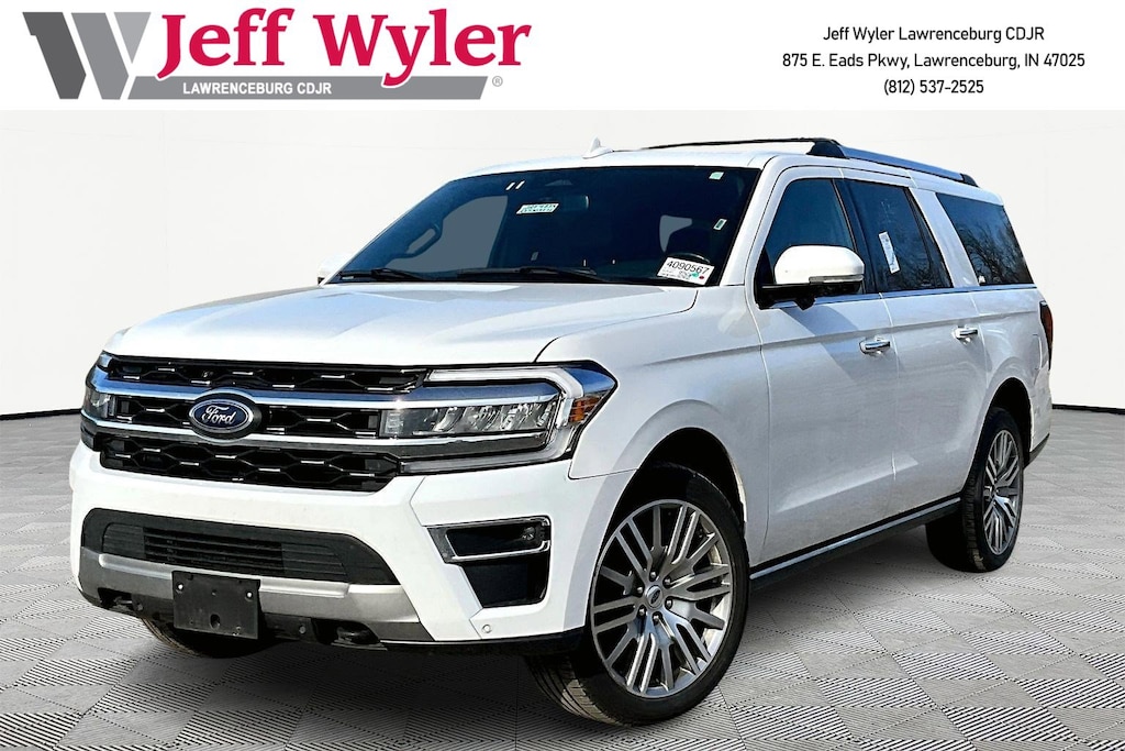 Jeff Wyler Chrysler Dodge Jeep of Lawrenceburg is proud to offer this superb 2023 Ford Expedition Max Limited in Oxford White. Equipment Group 302A High Package (Ebony Black Mesh Grille, Heavy-Duty Independent Suspension, Magnetic-Painted Power Deployable Running Boards, Power-Folding Sideview Mirrors w/Autofold, and Wheels: 22" 12-Spoke Polished Aluminum), Heavy-Duty Trailer Tow Package (26mm Engine Radiator, 360-Degree Camera w/Trailer Reverse Guidance, Integrated Trailer Brake Controller, and Pro Trailer Backup Assist), 12 Speakers, 360-Degree Camera w/Split View, 3rd row seats: split-bench, 4-Wheel Disc Brakes, ABS brakes, Adjustable pedals, Advanced Cargo Manager, Air Conditioning, Alloy wheels, AM/FM radio: SiriusXM with 360L, Auto High-beam Headlights, Auto-dimming door mirrors, Auto-dimming Rear-View mirror, Automatic temperature control, Black Roof-Rail Crossbars, Brake assist, Bumpers: body-color, Compass, Connected Built-In Navigation, Delay-off headlights, Driver door bin, Driver vanity mirror, Dual front impact airbags, Dual front side impact airbags, Electronic Stability Control, Emergency communication system: SYNC 4 911 Assist, Exterior Parking Camera Rear, Four wheel independent suspension, Front anti-roll bar, Front Bucket Seats, Front Center Armrest, Front dual zone A/C, Front fog lights, Front License Plate Bracket, Front reading lights, Fully automatic headlights, Garage door transmitter, Heated & Ventilated Leather Front Captain's Chairs, Heated door mirrors, Heated front seats, Heated rear seats, Heated steering wheel, Illuminated entry, Leather steering wheel, Low tire pressure warning, Memory seat, Navigation system: Connected Navigation, Occupant sensing airbag, Outside temperature display, Overhead airbag, Overhead console, Panic alarm, Passenger door bin, Passenger vanity mirror, Pedal memory, Power door mirrors, Power driver seat, Power Liftgate, Power moonroof, Power passenger seat, Power steering, Power windows, Radio data system, Radio: B&O Sound System by Bang & Olufsen, Rain sensing wipers, Rear air conditioning, Rear anti-roll bar, Rear reading lights, Rear window defroster, Rear window wiper, Reclining 3rd row seat, Remote keyless entry, Reverse Brake Assist, Second Row Power Windows Removal, Security system, SiriusXM w/360L, Speed control, Speed-sensing steering, Speed-Sensitive Wipers, Split folding rear seat, Spoiler, Steering wheel memory, Steering wheel mounted audio controls, SYNC 4 w/Enhanced Voice Recognition, Tachometer, Telescoping steering wheel, Tilt steering wheel, Traction control, Trip computer, Turn signal indicator mirrors, Variably intermittent wipers, Ventilated front seats, Voltmeter, and Wheels: 20" Bright Machined Aluminum Our PRE-OWNED vehicles are put through a rigorous 167- POINT QUALITY ASSURANCE INSPECTION along with an average amount of over $1,400.00 SPENT to recondition each vehicle so we can be sure to deliver you the highest quality vehicle like you deserve! ***ONLINE PRICE DOES NOT INCLUDE WYLER FAMILY FIRST PACKAGE*** Stop by 4136 Shelbyville Road to see for yourself, or give us a call @ 502-897-3151 to schedule your test drive! Ask about available certifications.