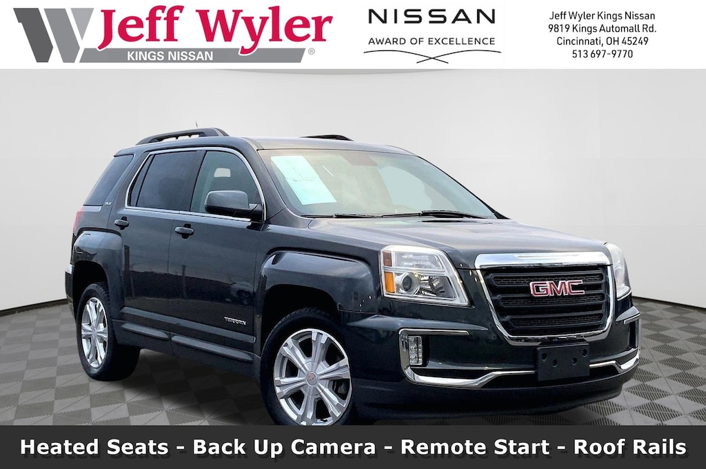 Jeff Wyler Kings Nissan is proud to offer this great 2017 GMC Terrain SLE-2 in Graphite Gray Metallic. Well equipped with: Convenience Package (Heated Driver & Front Passenger Seats and Remote Vehicle Start), Preferred Equipment Group 3SB (Bluetooth® For Phone, Leather-Wrapped Steering Wheel, and Single-Zone Automatic Climate Control), AWD, 3.53 Axle Ratio, 4-Wheel Disc Brakes, 8 Speakers, 8-Way Power Driver Seat Adjuster, ABS brakes, Air Conditioning, Alloy wheels, AM/FM radio: SiriusXM, Auto-dimming Rear-View mirror, Automatic temperature control, Brake assist, Bumpers: body-color, Cargo Area Close-Out Panel (LPO), Compass, Delay-off headlights, Driver door bin, Driver vanity mirror, Dual front impact airbags, Dual front side impact airbags, E10 Fuel Capable, Electronic Stability Control, Emergency communication system: OnStar Guidance, Exterior Parking Camera Rear, Four wheel independent suspension, Front anti-roll bar, Front Bucket Seats, Front Center Armrest, Front License Plate Bracket, Front reading lights, Fully automatic headlights, Heated door mirrors, Illuminated entry, IntelliLink, Low tire pressure warning, Occupant sensing airbag, Outside temperature display, Overhead airbag, Panic alarm, Passenger door bin, Passenger vanity mirror, Pioneer Premium 8-Speaker System, Power door mirrors, Power driver seat, Power steering, Power windows, Premium Cloth Seat Trim, Radio data system, Radio: Color Touch AM/FM Stereo, Rear anti-roll bar, Rear seat center armrest, Rear window defroster, Rear window wiper, Remote keyless entry, Roof rack: rails only, Security system, SiriusXM Satellite Radio, Speed control, Speed-sensing steering, Split folding rear seat, Spoiler, Steering wheel mounted audio controls, Tachometer, Telescoping steering wheel, Tilt steering wheel, Traction control, Trip computer, Variably intermittent wipers, and Wheels: 18" x 7" Aluminum (4)Ask about available certifications.