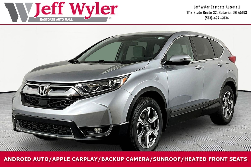 Jeff Wyler Eastgate Auto Mall is proud to offer this stunning 2019 Honda CR-V EX in Silver. Well equipped with: 18" Alloy Wheels, 4-Wheel Disc Brakes, 5.64 Axle Ratio, 6 Speakers, ABS brakes, Air Conditioning, Alloy wheels, AM/FM radio: SiriusXM, Apple CarPlay/Android Auto, Auto High-beam Headlights, Automatic temperature control, Blind Spot Information (BSI) System warning, Brake assist, Bumpers: body-color, Cloth Seat Trim, Compass, Delay-off headlights, Driver door bin, Driver vanity mirror, Dual front impact airbags, Dual front side impact airbags, Electronic Stability Control, Exterior Parking Camera Rear, Forward collision: Collision Mitigation Braking System (CMBS) + FCW mitigation, Four wheel independent suspension, Front anti-roll bar, Front Bucket Seats, Front Center Armrest, Front dual zone A/C, Front fog lights, Front reading lights, Fully automatic headlights, Heated door mirrors, Heated Front Bucket Seats, Heated front seats, Illuminated entry, Lane departure: Lane Keeping Assist System (LKAS) active, Low tire pressure warning, Occupant sensing airbag, Outside temperature display, Overhead airbag, Overhead console, Panic alarm, Passenger door bin, Passenger vanity mirror, Power door mirrors, Power driver seat, Power moonroof, Power steering, Power windows, Radio data system, Radio: AM/FM Audio System w/6 Speakers, Rear anti-roll bar, Rear seat center armrest, Rear window defroster, Rear window wiper, Remote keyless entry, Security system, Speed control, Speed-sensing steering, Speed-Sensitive Wipers, Split folding rear seat, Spoiler, Steering wheel mounted audio controls, Tachometer, Telescoping steering wheel, Tilt steering wheel, Traction control, Trip computer, Turn signal indicator mirrors, and Variably intermittent wipers. Ask about available certifications. Used vehicles 10 years of age or newer with less than 100,000 miles are eligible for the Wyler Assurance Program, but eligible vehicles must pass our reconditioning process and multi-point inspection. Provided the vehicle passes inspection, vehicles will be eligible for the 6 month/6,000 mile limited warranty. The 6 month/6,000 mile limited warranty is NOT available on AS-IS vehicles, wholesale vehicles, lease buyback/pass-thru vehicles or un-inspected vehicles. Note that this program can also apply to vehicles where the remaining factory coverage is less than 6 months or 6,000 miles. Please check the Federal Trade Commission (FTC) Buyers guide on the vehicle for full details as to whether or not warranty coverage may apply. Contact Dealer for additional details. The Wyler Assurance 6 month/6,000 Mile limited warranty ends 6 months from the date of the Retail Purchase Agreement (BUYERS ORDER) or when the vehicle's odometer registers 6,000 additional miles to the mileage listed on the BUYERS ORDER, whichever comes first. Your Deductible - The warranty holder on your contract pays the first $100 of each covered repair.