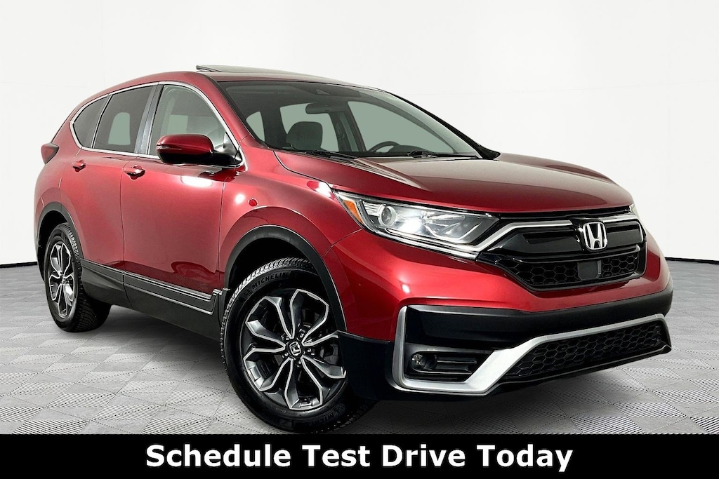 Jeff Wyler Honda of Colerain is pleased to offer this terrific-looking 2021 Honda CR-V EX in Radiant Red Metallic. Well equipped with: 18" Alloy Wheels, 4-Wheel Disc Brakes, 5.64 Axle Ratio, 6 Speakers, ABS brakes, Adaptive Cruise Control: Adaptive Cruise Control (ACC) with Low-Speed Follow, Air Conditioning, Alloy wheels, AM/FM radio: SiriusXM, Apple CarPlay/Android Auto, Auto High-beam Headlights, Automatic temperature control, Blind Spot Information (BSI) System warning, Brake assist, Bumpers: body-color, Cloth Seat Trim, Compass, Delay-off headlights, Driver door bin, Driver vanity mirror, Dual front impact airbags, Dual front side impact airbags, Electronic Stability Control, Exterior Parking Camera Rear, Forward collision: Collision Mitigation Braking System (CMBS) + FCW mitigation, Four wheel independent suspension, Front anti-roll bar, Front Bucket Seats, Front Center Armrest, Front dual zone A/C, Front fog lights, Front reading lights, Heated door mirrors, Heated Front Bucket Seats, Heated front seats, Illuminated entry, Low tire pressure warning, Occupant sensing airbag, Outside temperature display, Overhead airbag, Overhead console, Panic alarm, Passenger door bin, Passenger vanity mirror, Power door mirrors, Power driver seat, Power moonroof, Power steering, Power windows, Radio data system, Radio: 180-Watt AM/FM/HD/SiriusXM Audio System, Rear anti-roll bar, Rear seat center armrest, Rear window defroster, Rear window wiper, Remote keyless entry, Security system, Speed control, Speed-sensing steering, Speed-Sensitive Wipers, Split folding rear seat, Spoiler, Steering wheel mounted audio controls, Tachometer, Telescoping steering wheel, Tilt steering wheel, Traction control, Trip computer, Turn signal indicator mirrors, and Variably intermittent wipers.