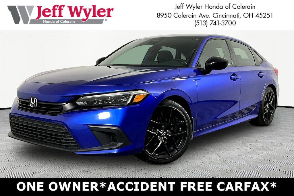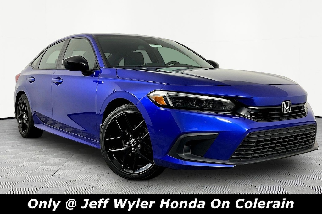 Jeff Wyler Honda of Colerain is pleased to offer this beautiful-looking 2023 Honda Civic Sport in Aegean Blue Metallic. Well equipped with: 4-Wheel Disc Brakes, 8 Speakers, ABS brakes, Adaptive Cruise Control: Adaptive Cruise Control (ACC) with Low-Speed Follow, Air Conditioning, Alloy wheels, AM/FM radio, Apple CarPlay/Android Auto, Auto High-beam Headlights, Automatic temperature control, Brake assist, Bumpers: body-color, Cloth Seat Trim, Delay-off headlights, Driver door bin, Driver vanity mirror, Dual front impact airbags, Dual front side impact airbags, Electronic Stability Control, Emergency communication system: HondaLink, Exterior Parking Camera Rear, Four wheel independent suspension, Front anti-roll bar, Front Bucket Seats, Front Center Armrest, Front reading lights, Fully automatic headlights, Illuminated entry, Knee airbag, Leather Shift Knob, Leather steering wheel, Low tire pressure warning, Occupant sensing airbag, Outside temperature display, Overhead airbag, Panic alarm, Passenger door bin, Passenger vanity mirror, Power door mirrors, Power steering, Power windows, Radio data system, Radio: 180-Watt Audio System w/8 Speakers, Rear anti-roll bar, Rear side impact airbag, Rear window defroster, Remote keyless entry, Security system, Speed control, Speed-sensing steering, Steering wheel mounted audio controls, Tachometer, Telescoping steering wheel, Tilt steering wheel, Traction control, Trip computer, and Wheels: 18" Gloss Black Alloy.
